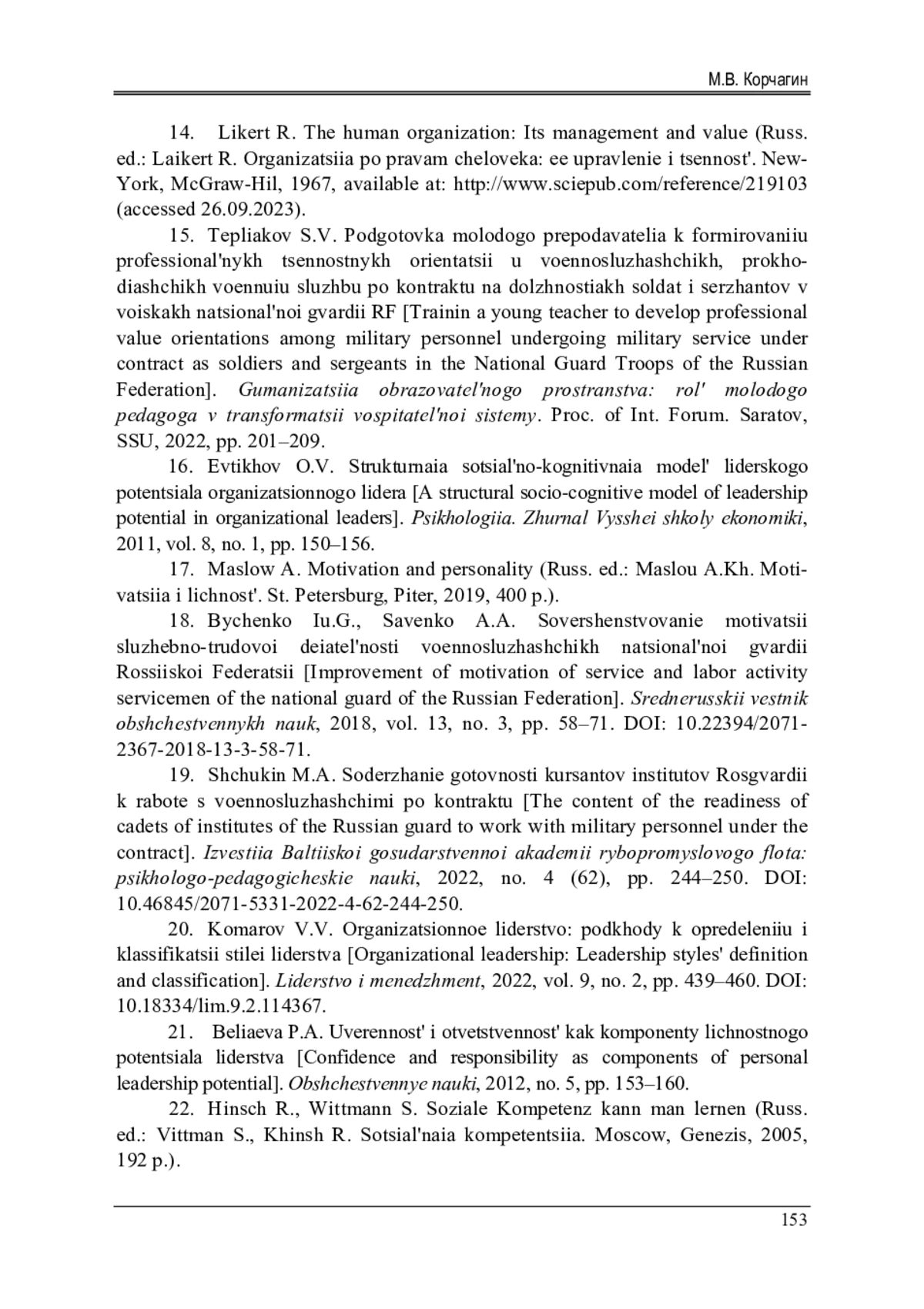19. Щукин М.А. Содержание готовности курсантов институтов Росгвардии к работе с военнослужащими по контракту // Известия Балтийской государственной академии рыбопромыслового флота: психолого-педагогические науки. - 2022. - № 4 (62). - С. 244-250. DOI: 10.46845/2071-5331-2022-4-62-244-250 EDN: JJZSHF