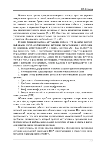 Посредством контентного анализа выделены и проанализированы современные проблемы интегрированного управления рисками (ИУР), сформулированные отечественными и зарубежными авторами в рецензируемых научных изданиях. Проведено обобщение и группировка заявленных проблем и подтвержден систематический характер некоторых из них, что сформировало запрос на выявление коренной проблемы, многомерность которой требует ситуативного применения конкретных моделей, выбираемых в рамках некоторого общего подхода к вопросам интегрирования управления рисками. Выделена перспективная возможность по поиску уместного динамического баланса возрастающих в ходе развития интеграции и дифференциации ИУР, представленного в виде организационной трансформации, отвечающей условию поддержания целостности организации как баланса системообразующих и системоразрушающих факторов. Сконструирована модель организационной трансформации, где ИУР выступает в роли гармонизатора конфликтующих векторов стабилизирующей операционной и развивающей стратегической деятельности для их сведения к генеральной цели создания устойчивой ценности. В качестве канвы для целостного взгляда на ИУР разработан матричный системный конфигуратор, структурирующий подход к балансу интегрированности и дифференциации управления рисками на основе трех измерений: «Рациональность - Иррациональность», «Проактивность - Пассивность» и «Простота - Сложность», философско-методологические основы которых заимствованы из работ В. Е. Лепского, А. Г. Мадеры и И. Пригожина соответственно. Таким образом, систематизировано многообразие ориентировочных сценариев, подлежащих достижению посредством практико-ориентированных моделей. Подчеркивается, что максимально доступная интеграция управления рисками не выступает в роли безусловной доминанты, а зависит от множества ситуативных факторов, проистекающих из внутреннего и внешнего бизнес-контекста предприятия.