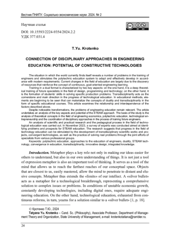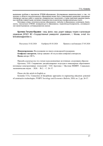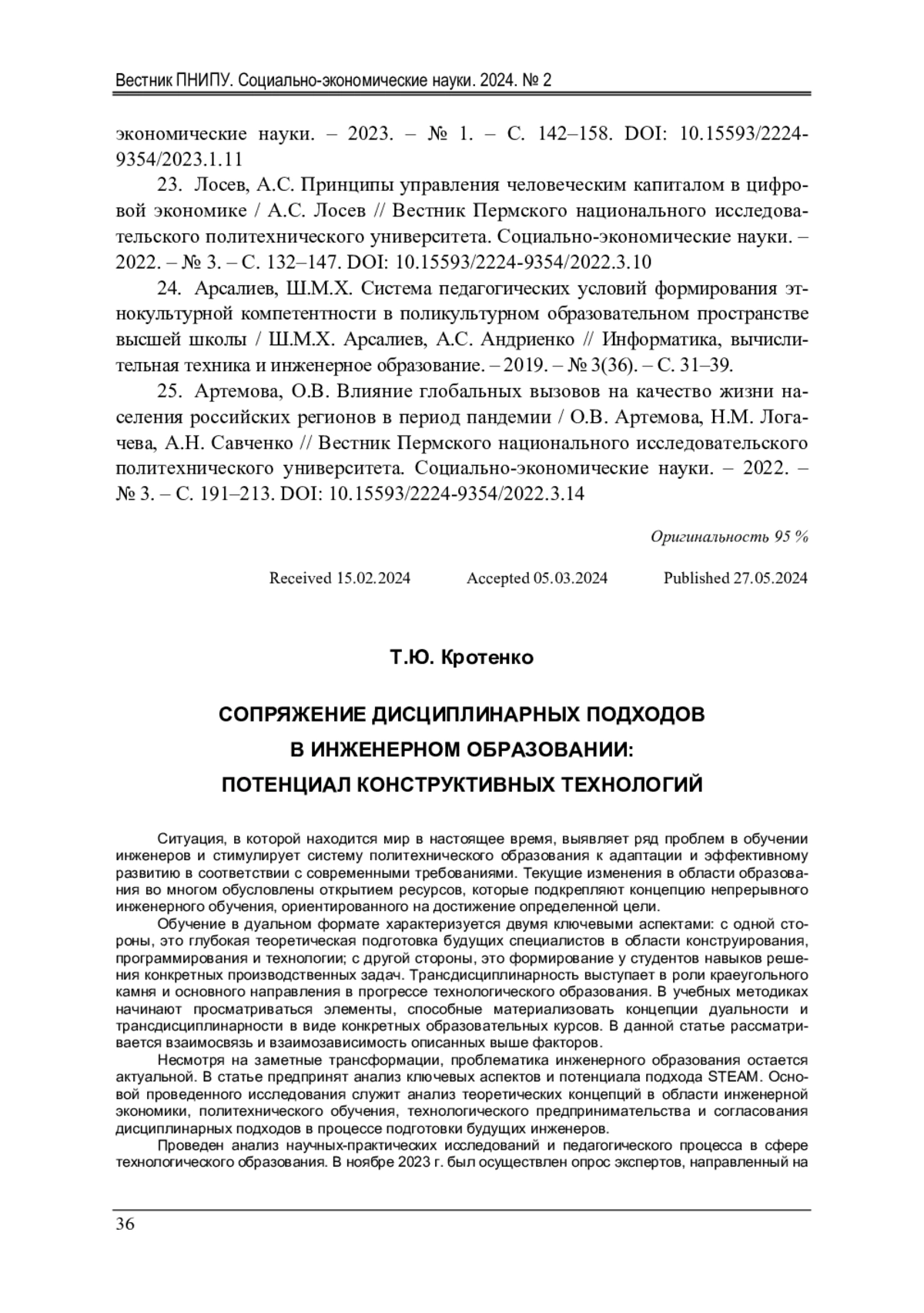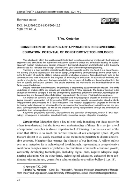КРОТЕНКО Т. Ю. СОПРЯЖЕНИЕ ДИСЦИПЛИНАРНЫХ ПОДХОДОВ В ИНЖЕНЕРНОМ ОБРАЗОВАНИИ: ПОТЕНЦИАЛ КОНСТРУКТИВНЫХ ТЕХНОЛОГИЙ // ВЕСТНИК ПЕРМСКОГО НАЦИОНАЛЬНОГО ИССЛЕДОВАТЕЛЬСКОГО ПОЛИТЕХНИЧЕСКОГО УНИВЕРСИТЕТА. СОЦИАЛЬНО-ЭКОНОМИЧЕСКИЕ НАУКИ. 2024. № 2