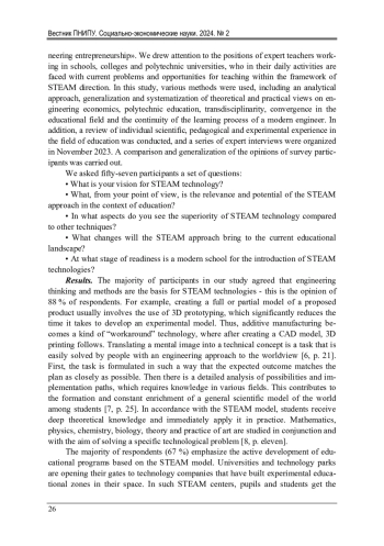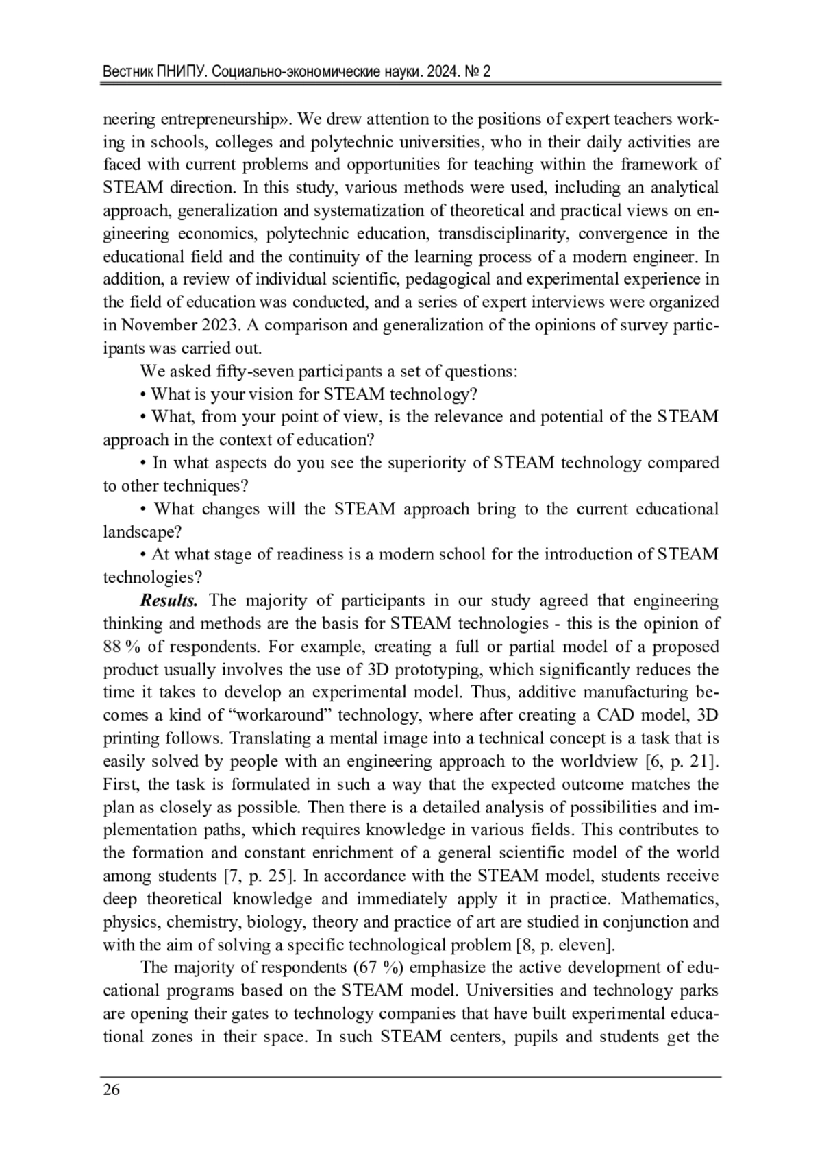 Ситуация, в которой находится мир в настоящее время, выявляет ряд проблем в обучении инженеров и стимулирует систему политехнического образования к адаптации и эффективному развитию в соответствии с современными требованиями. Текущие изменения в области образования во многом обусловлены открытием ресурсов, которые подкрепляют концепцию непрерывного инженерного обучения, ориентированного на достижение определенной цели. Обучение в дуальном формате характеризуется двумя ключевыми аспектами: с одной стороны, это глубокая теоретическая подготовка будущих специалистов в области конструирования, программирования и технологии; с другой стороны, это формирование у студентов навыков решения конкретных производственных задач. Трансдисциплинарность выступает в роли краеугольного камня и основного направления в прогрессе технологического образования. В учебных методиках начинают просматриваться элементы, способные материализовать концепции дуальности и трансдисциплинарности в виде конкретных образовательных курсов. В данной статье рассматривается взаимосвязь и взаимозависимость описанных выше факторов. Несмотря на заметные трансформации, проблематика инженерного образования остается актуальной. В статье предпринят анализ ключевых аспектов и потенциала подхода STEAM. Основой проведенного исследования служит анализ теоретических концепций в области инженерной экономики, политехнического обучения, технологического предпринимательства и согласования дисциплинарных подходов в процессе подготовки будущих инженеров. Проведен анализ научных-практических исследований и педагогического процесса в сфере технологического образования. В ноябре 2023 г. был осуществлен опрос экспертов, направленный на выявление проблем и перспектив STEAM-образования. Исследование свидетельствуют о том, что прогресс в области технологического образования может быть стимулирован развитием трансдисциплинарных научных работ и проектов, конвергентных технологий, а также практикой решения реальных проблем совместными усилиями специалистов из различных профессиональных групп.
