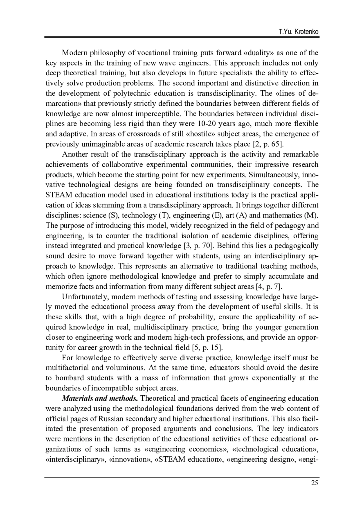 Ключевые фразы: политехническое образование, подходы в образовании инженеров, дуальность, технология steam, конвергенция в образовании, трансдисциплинарность, инновационное проектирование, интегрированное знание