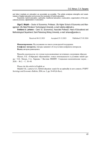 Цифровизация всех сфер жизнедеятельности общества иногда порождает неверные предположения о ее безграничных возможностях. Принято считать, что электронное образование дает хорошие результаты и требует меньше затрат. Однако практика последних лет показывает, что формат электронного образования следует рассматривать более детально, выделяя каждую цель, для реализации которой этот формат используется. Важно учитывать совокупность факторов и условий, которые могут повысить эффективность электронного образования и к числу которых можно отнести высокий уровень цифровизации всего учебного процесса, наличие институциональной рамки цифровизации образования, обеспечение оценки и самооценки базовых цифровых навыков студентов и преподавателей, готовность и умение взаимодействовать в дистанционном формате студентов и преподавателей. При таком подходе можно увидеть, что существуют ограничения его применения по уровням образования, по механизмам наработки профессиональных компетенций, по степени социально-психологического воздействия. Также следует учитывать сферу социально-трудовых отношений в части создания и ликвидации рабочих мест, напряженности и интенсивности труда, определения заработной платы и организации рабочего места. Признавая положительные результаты использования дистанционной формы электронного образования в период кризиса пандемии, нужно развивать широкую дискуссию относительно формата современного образования. Принимая во внимание несовпадение «временных горизонтов развития» системы образования и отдельного человека, отдельной организации, важно как можно более адекватно оценивать влияние на образование различного рода изменений (изменений глобального миропорядка, товарных рынков и рынка труда). В статье анализируются сильные и слабые стороны традиционного и электронного образования, обосновывается оптимальность формата «гибридного образования».