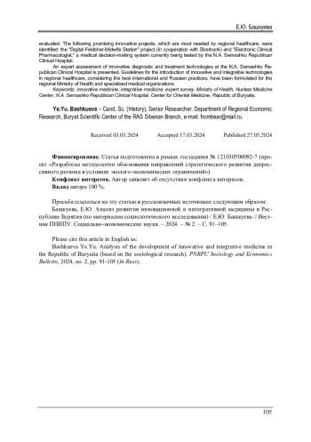Рассмотрены проблемы и перспективы развития инновационной и интегративной медицины в Республике Бурятия, выявленные на основе проведенных автором социологических исследований. Необходимость такого исследования обусловлена малым количеством внедренных инновационных и интегративных проектов в здравоохранении Республики Бурятия по сравнению с другими регионами и недостаточной оценкой эффективности внедряемых технологий со стороны региональных органов управления здравоохранением. Выявлены изъяны организационно-методической работы регионального министерства здравоохранения по содействию инновационному развитию подведомственных медицинских организаций и внедрению медицинских инноваций. Предложено осуществлять мониторинг инновационной деятельности и реализуемых проектов медицинских организаций региона с использованием комплексных социолого-экономических методик. Дана оценка деятельности Центра ядерной медицины как медицинской организации инновационного типа, оказывающей высокотехнологичную медицинскую помощь и Центра восточной медицины как медицинской организации, оказывающей медицинскую помощь на основе интегративных методов лечения и реабилитации. Определены перспективные инновационные проекты, наиболее востребованные для регионального здравоохранения: совместный с ПАО «Сбербанк» проект «Цифровой ФАП» и система принятия врачебных решений «Электронный клинический фармаколог, апробируемая в ГАУЗ «Республиканская клиническая больница им. Н. А. Семашко». Представлена экспертная оценка внедрения инновационных технологий диагностики и лечения в ГАУЗ «Республиканская клиническая больница им. Н. А. Семашко». Сформулированы для регионального министерства здравоохранения и профильных медицинских организаций научно-практические рекомендации по внедрению инновационных и интегративных технологий в региональное здравоохранение с учетом передового мирового и российского опытов.