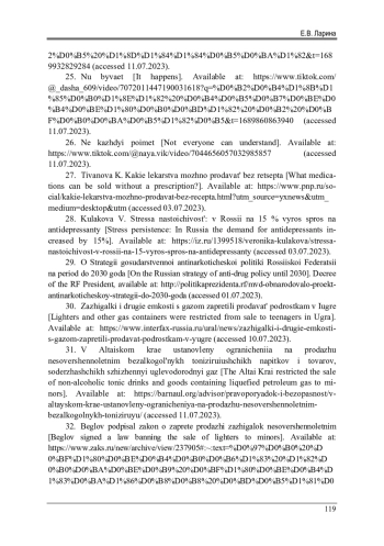31. В Алтайском крае установлены ограничения на продажу несовершеннолетним безалкогольных тонизирующих напитков и товаров, содержащих сжиженный углеводородный газ [Электронный ресурс] // Официальный сайт города Барнаул. - URL: https://barnaul.org/advisor/pravoporyadok-i-bezopasnost/ v-altayskom-krae-ustanovleny-ogranicheniya-na-prodazhu-nesovershennoletnim-bezalkogolnykh-toniziruyu/(дата обращения: 11.07.2023).