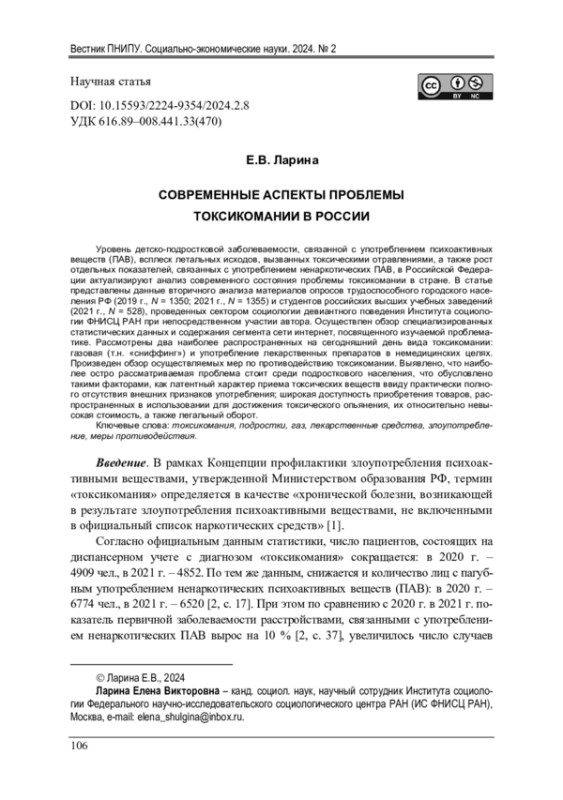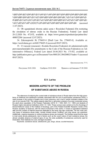Уровень детско-подростковой заболеваемости, связанной с употреблением психоактивных веществ (ПАВ), всплеск летальных исходов, вызванных токсическими отравлениями, а также рост отдельных показателей, связанных с употреблением ненаркотических ПАВ, в Российской Федерации актуализируют анализ современного состояния проблемы токсикомании в стране. В статье представлены данные вторичного анализа материалов опросов трудоспособного городского населения РФ (2019 г., N = 1350; 2021 г., N = 1355) и студентов российских высших учебных заведений (2021 г., N = 528), проведенных сектором социологии девиантного поведения Института социологии ФНИСЦ РАН при непосредственном участии автора. Осуществлен обзор специализированных статистических данных и содержания сегмента сети интернет, посвященного изучаемой проблематике. Рассмотрены два наиболее распространенных на сегодняшний день вида токсикомании: газовая (т. н. «сниффинг») и употребление лекарственных препаратов в немедицинских целях. Произведен обзор осуществляемых мер по противодействию токсикомании. Выявлено, что наиболее остро рассматриваемая проблема стоит среди подросткового населения, что обусловлено такими факторами, как латентный характер приема токсических веществ ввиду практически полного отсутствия внешних признаков употребления; широкая доступность приобретения товаров, распространенных в использовании для достижения токсического опьянения, их относительно невысокая стоимость, а также легальный оборот.