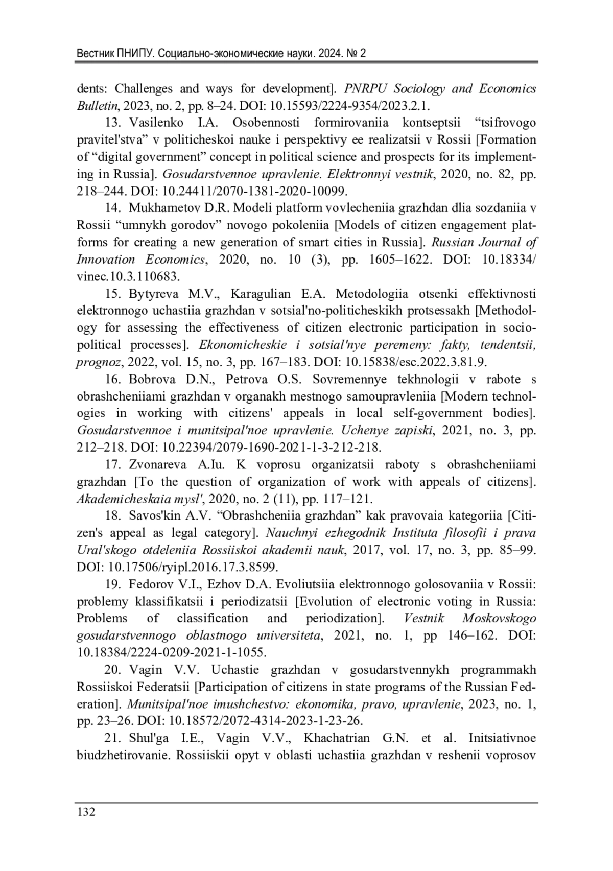 15. Бытырева, М.В. Методология оценки эффективности электронного участия граждан в социально-политических процессах / М.В. Бытырева, Е.А. Карагулян // Экономические и социальные перемены: факты, тенденции, прогноз. - 2022. - Т. 15, № 3. - С. 167-183. DOI: 10.15838/esc.2022.3.81.9 EDN: AUYAFG