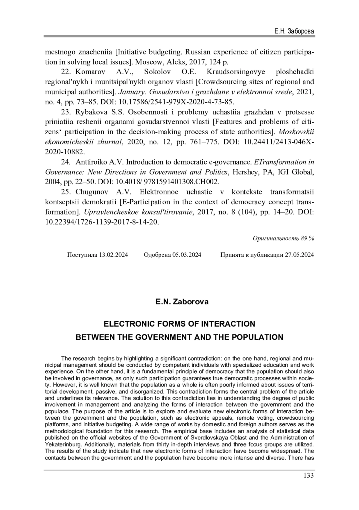 24. Anttiroiko, A.-V.Introduction to democratic e-governance / A.-V. Anttiroiko // ETransformation in Governance: New Directions in Government and Politics. - Hershey, PA: IGI Global, 2004. - P. 22-50. 10.4018/9781591401308. CH002. DOI: 10.4018/9781591401308.CH002
