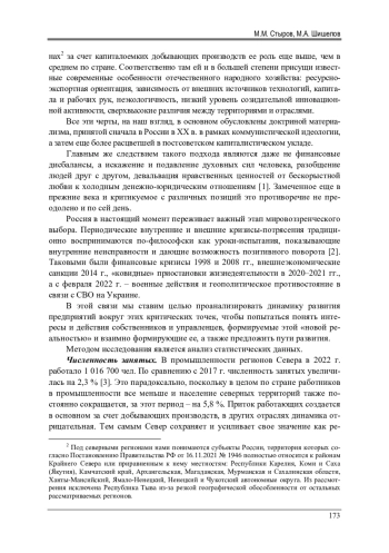 Введение. Промышленность1 была и остается сердцевиной экономики, обеспечивая людей материальными средствами для жизни. В северных регионах2 за счет капиталоемких добывающих производств ее роль еще выше, чем в среднем по стране. Соответственно там ей и в большей степени присущи известные современные особенности отечественного народного хозяйства: ресурсноэкспортная ориентация, зависимость от внешних источников технологий, капитала и рабочих рук, неэкологичность, низкий уровень созидательной инновационной активности, сверхвысокие различия между территориями и отраслями.