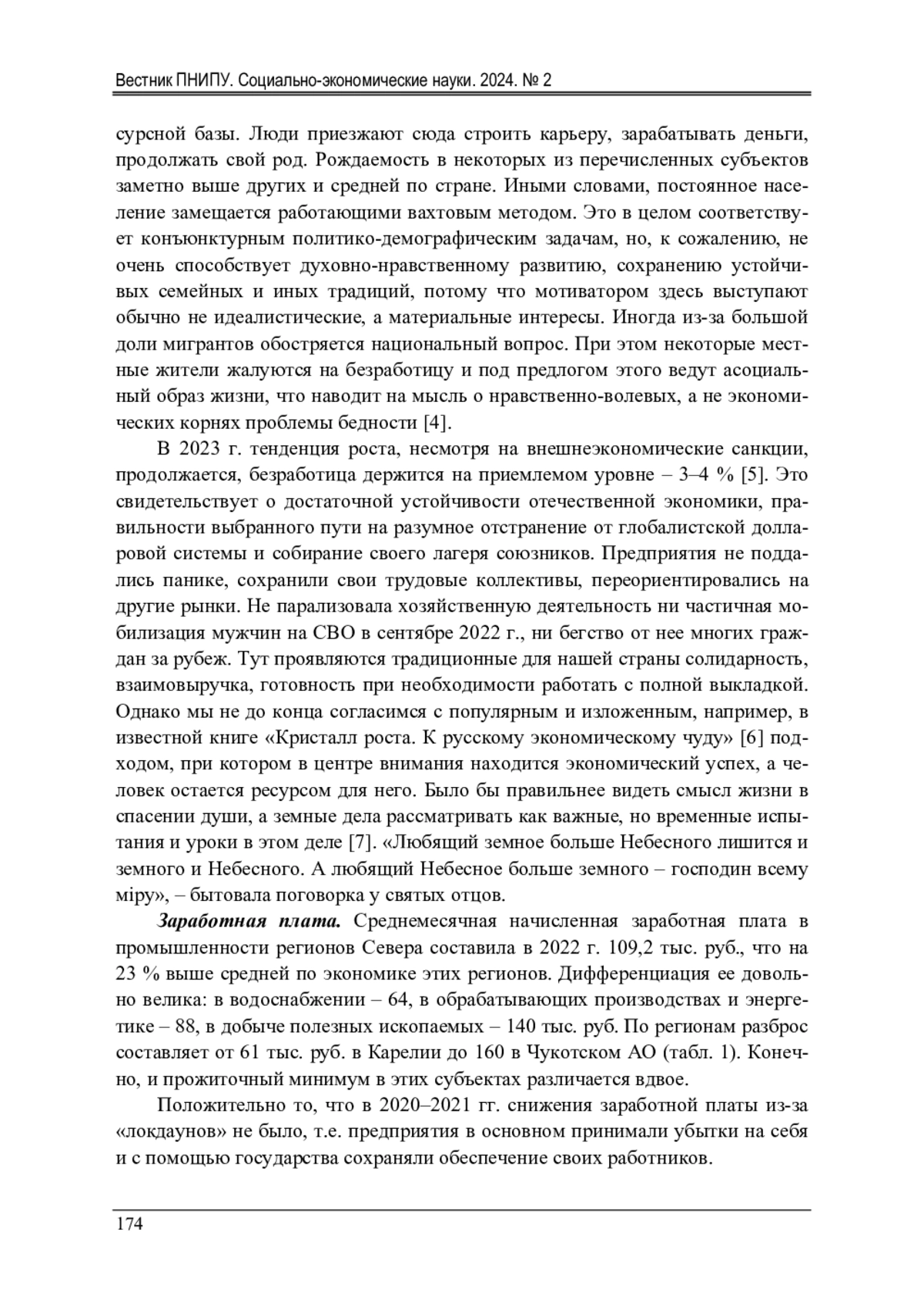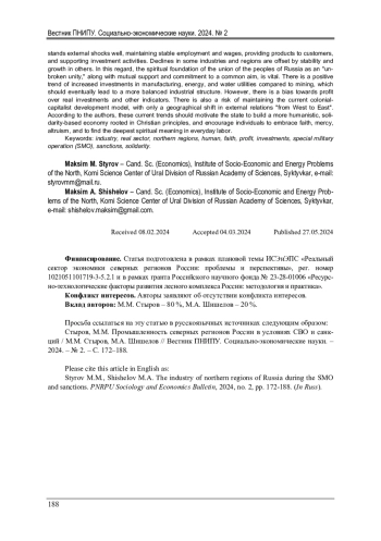 Рассматривается развитие промышленности Севера России в период с 2017 по 2023 г., особенное внимание уделено 2020-2021 гг. как периоду «коронавируса» и 2022-2023 гг. как времени специальной военной операции на Украине (СВО) и международных санкций в отношении нашей страны. Проанализированы показатели численности занятых, уровня оплаты труда, индекса производства, налоговых платежей, инвестиций, сальдированной прибыли. Отмечено, что промышленность северных регионов в целом хорошо выдерживает внешние шоки, сохраняя работников и их заработную плату, обеспечивая заказчиков продукцией и поддерживая инвестиционную деятельность. Спады в отдельных отраслях и регионах компенсируются стабильностью и подъемом в других. В этой связи важным является духовный базис союза народов России как «неслиянного единства», взаимопомощи и служения общему делу. Наблюдается позитивная тенденция опережающих вложений в обрабатывающие, энергетические и водоснабжающие предприятия по сравнению с добывающими, что со временем должно привести к выравниванию отраслевой структуры. Вместе с тем имеется перекос в сторону извлечения прибыли по сравнению с реальными инвестициями и другими показателями. Существует также опасность сохранения сложившейся колониально-капиталистической модели развития с переключением лишь географической ориентации внешних связей «с Запада на Восток». Имеющиеся тенденции, по мнению авторов, должны побуждать государство к созданию более человеколюбивой, солидарной экономики на христианских принципах, а каждого человека - к горячей вере, милосердию, нестяжанию и поиску в повседневных трудах высшего духовного смысла.