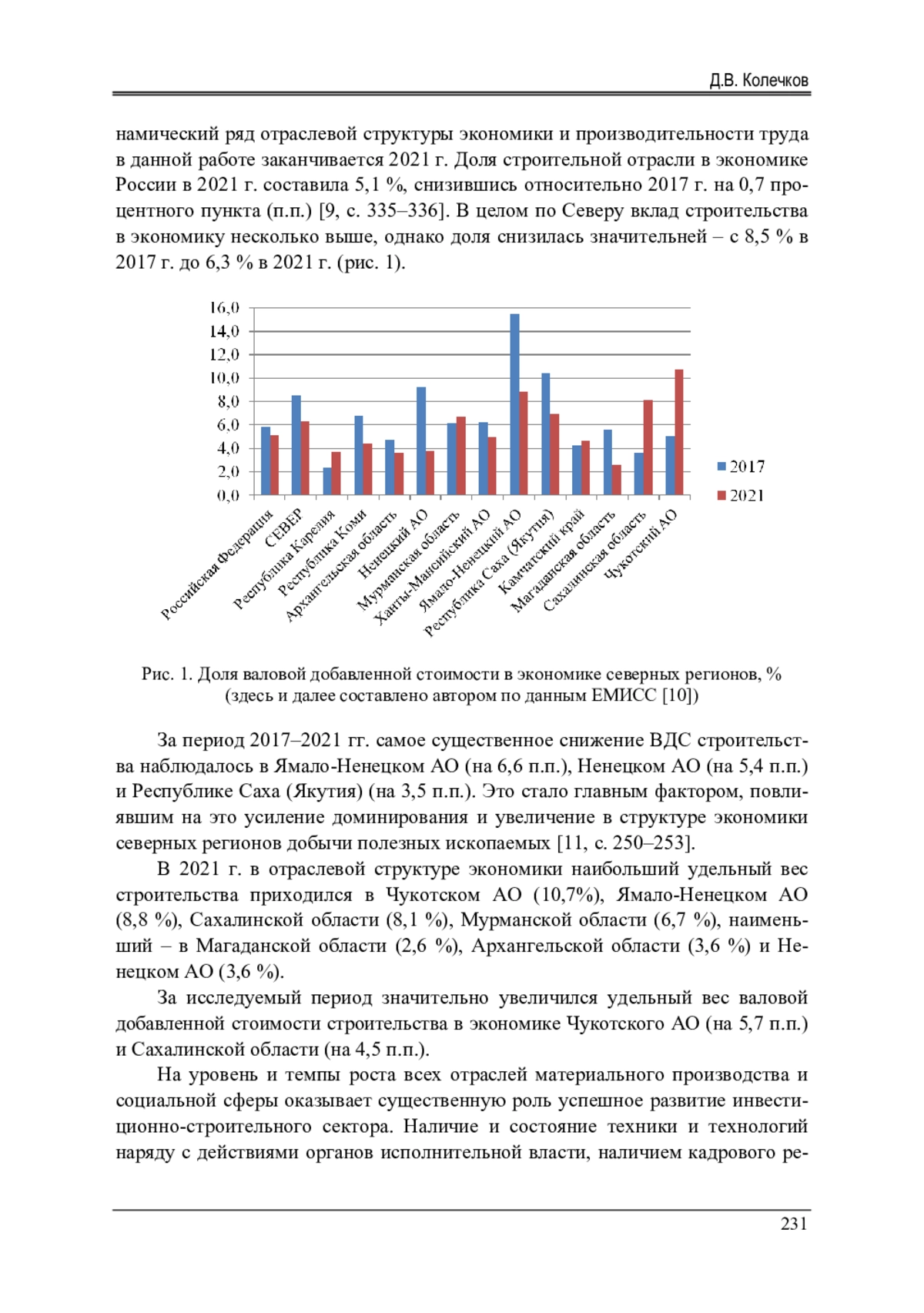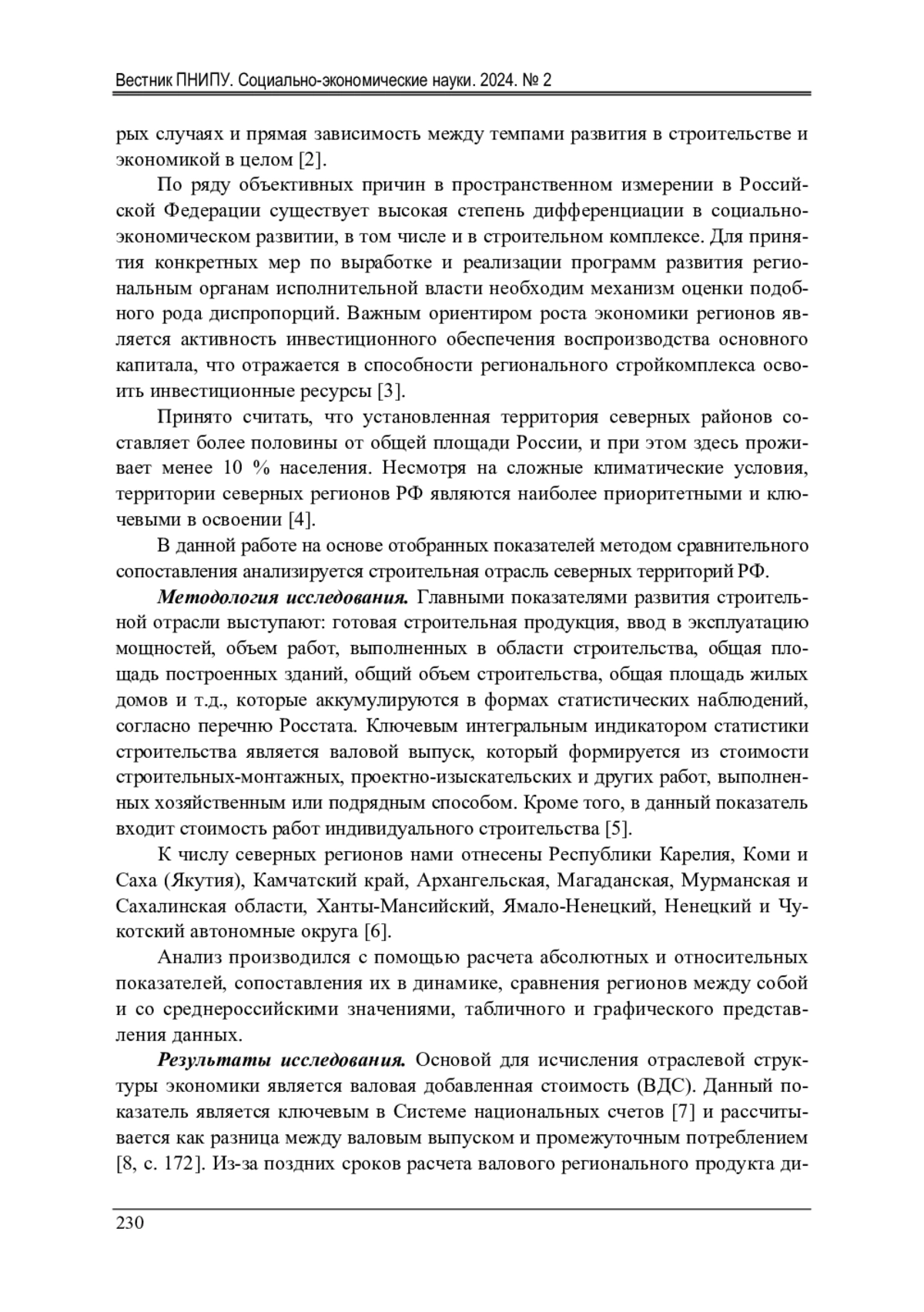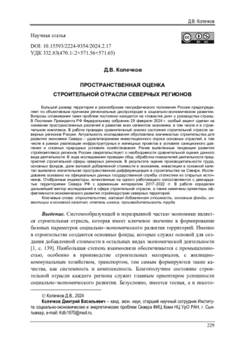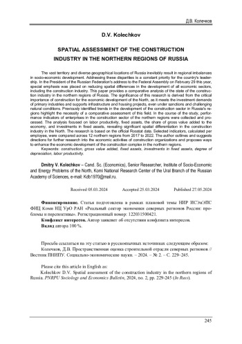 Большой размер территории и разнообразие географического положения России предопределяет по объективным причинам региональные диспропорции в социально-экономическом развитии. Вопросы сглаживания таких проблем постоянно находится на «повестке дня» у руководства страны. В Послании Президента РФ Федеральному собранию 29 февраля 2024 г. особый акцент сделан на снижение пространственных различий в развитии всех сегментов экономики, в том числе и в строительном комплексе. В работе проведен сравнительный анализ состояния строительной отрасли северных регионов России. Актуальность исследования обусловлена значимостью строительства для развития экономики Севера - удовлетворением инвестиционного спроса основных отраслей, в том числе в рамках реализации инфраструктурных и жилищных проектов в условиях санкционного давления и сложных природных условиях хозяйствования. Ранее выявленные тенденции развития стройкомплекса регионов России свидетельствуют о необходимости сравнительной оценки данного вида деятельности. В ходе исследования проведен сбор, обработка показателей деятельности предприятий строительной сферы северных регионов. В результате оценки производительности труда, основных фондов, доли валовой добавленной стоимости в экономике, инвестиции в основной капитал выявлена значительная пространственная дифференциация в строительстве на Севере. Исследование основано на официальных данных государственной службы статистики из открытых источников. Отобранные индикаторы, исчисленные на одного работающего сопоставляются с двенадцатью территориями Севера РФ с временн ы м интервалом 2017-2022 гг. В работе определен дальнейший вектор исследований в сфере строительной отрасли, а также намечены ориентиры эффективности экономического развития стройиндустрии северных территорий.