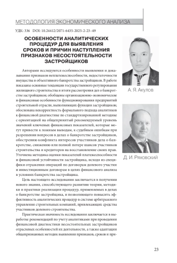 Авторами исследуются особенности выявления и доказывания признаков неплатежеспособности, недостаточности имущества и объективного банкротства застройщиков. В работе показаны основные тенденции государственного регулирования жилищного строительства и итоги рассмотрения дел о банкротстве застройщиков; обобщены организационно-экономические и финансовые особенности функционирования предприятий строительной отрасли, выполняющих функции застройщиков; обоснована некорректность формального подхода аналитиков к финансовой диагностике по стандартизированной методике с ориентацией на общепринятый рекомендуемый уровень значений ключевых финансовых показателей, которые могут привести к ложным выводам, к судебным ошибкам при разрешении вопросов в делах о банкротстве застройщиков, обострению конфликта интересов участников дела о банкротстве, снижению или полной потере шансов участников строительства и кредиторов на восстановление своих прав. Уточнена методика оценки показателей платежеспособности и финансовой устойчивости застройщика, исходя из специфики отражения операций по договорам долевого участия и инвестиционным договорам в целях финансового анализа в условиях банкротства застройщика.