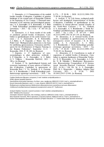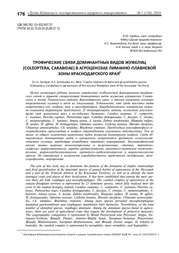 Целью настоящей работы являлось определение особенностей формирования трофических связей и пищевой специализации доминантных видов жужелиц агроценозов Славянского и части Темрюкского районов Краснодарского края, а также выявление основных повреждаемых культур и мест их локализации. Установлено, что среди массовых видов встречаются как зоофаги, так и миксофитофаги. Карабидокомплекс агроценозов лиманно-плавневой территории представлен 23 доминирующими видами, полностью реализующими свой жизненный цикл в исследуемых биотопах: Carabus cumanus, C. campestris, C. exaratus, Poecilus cupreus, Pterostichus niger, Сalathus distinguendus, C. fuscipes, C. erratus, C. melanocephalus, C. halensis, Amara aenea, A. lucida, Zabrus tenebrioides, Harpalus rufipes, H. tardus, H. affinis, H. distinguendus, Ophonus azureus, Callistus lunatus, Dinodes decipiens, Chlaenius aeneocephalus, Ch. nitidulus, Brachinus crepitans. Преобладали миксофитофаги геохортобионты гарпалоидные и зоофаги стратобионты скважники подстилочные. Тем не менее, из общего количества выявленных видов жужелиц доминируют зоофаги. Среди обнаруженных доминантных видов в агроценозах встречаются вредители сельскохозяйственных культур, требующие разработки защитных мероприятий. Зоогеографический анализ выявил широкие полисекторальные и полизональные, степные, европейско-скифские, широкотетийские, передне-среднеазиатские, европейско-туранские полисекторальные, широкосредиземноморские, европейско-средиземноморские и широкоэвксинские ареалы. По отношению к влажности карабидокомплекс представлен мезофилами, мезо-ксерофилами, гигрофилами.