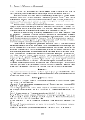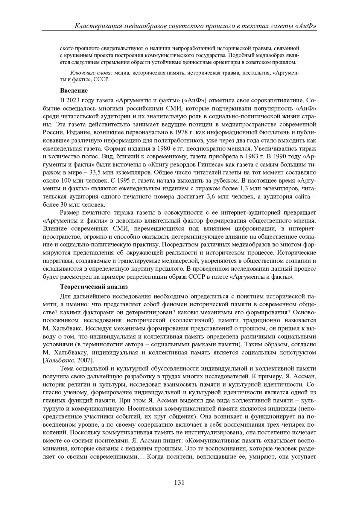 Представлены результаты математического анализа статей газеты «Аргументы и факты», связанных с советским периодом истории. Выбор темы исследования обусловлен возросшей ролью советского исторического наследия в современной российской социально-политической практике и идеологическом дискурсе. Цель исследования - выявление наиболее характерных черт медиаобраза СССР, конструируемого и транслируемого российской медиасредой, и особенностей исторической памяти современного российского общества. Для этого были проанализированы публикации за период с 2014 по 2022 г., в результате чего были выделены тематические кластеры, отражающие характерные черты медиаобраза Советского Союза. Кроме того, был проанализирован архив публикаций с 1983 по 1991 г. Обращение к данному временному диапазону позволило установить круг тем, присутствовавших в статьях газеты «Аргументы и факты», и сопоставить их с темами публикаций постсоветского периода (2014-2022). Для анализа современного медиаобраза СССР были выбраны первые десять (по наибольшему количеству публикаций) кластеров. Исследование показало, что выделенные тематические кластеры связаны с теми или иными достижениями Советского Союза или же с негативными последствиями его распада. Статьи выделенных кластеров конструируют образ сильного, обладающего большим потенциалом государства с богатым культурным наследием, распад которого стал катастрофическим событием. Конструирование и трансляция в медиасреде данного образа советского прошлого свидетельствуют о наличии непроработанной исторической травмы, связанной с крушением проекта построения коммунистического государства. Подобный медиаобраз является следствием стремления обрести устойчивые ценностные ориентиры в советском прошлом.