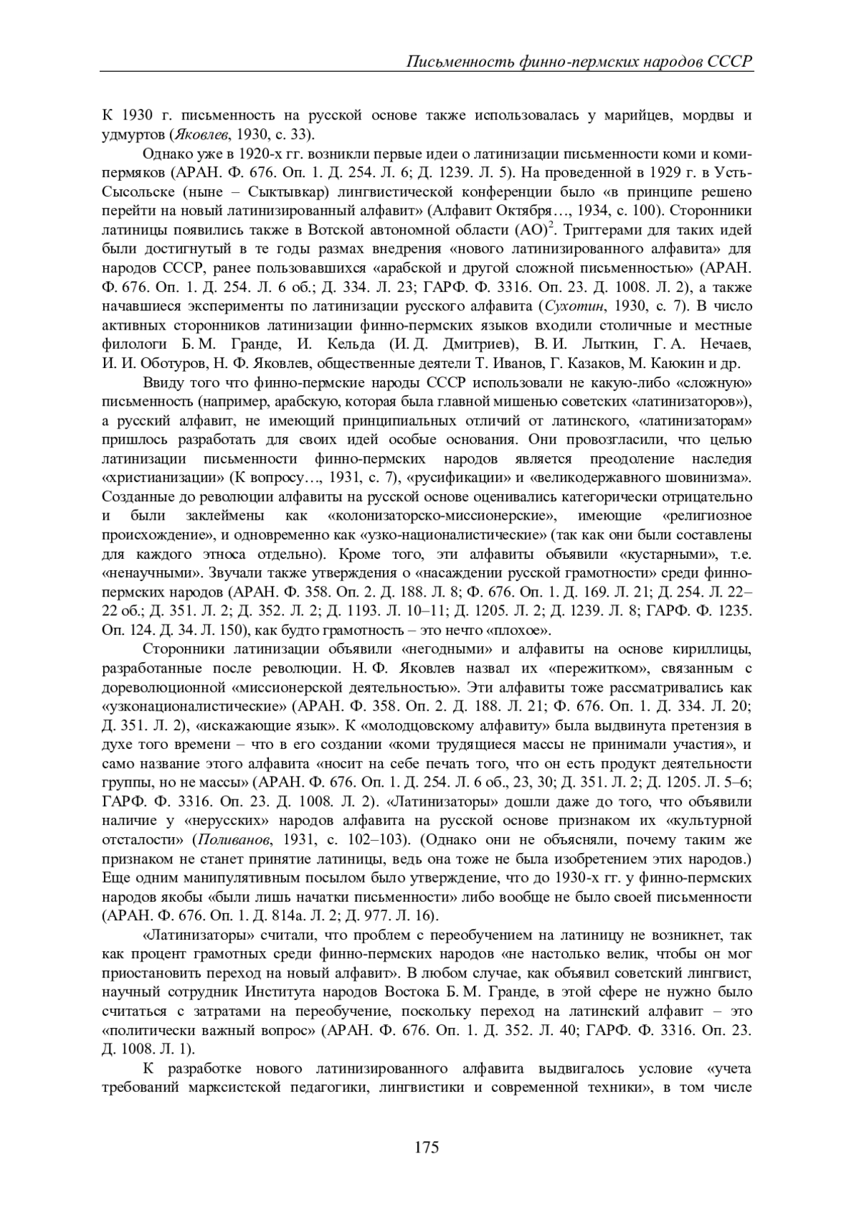 До революции для многих финно-пермских народов были разработаны алфавиты на основе кириллицы. Продолжался этот процесс и при советской власти. Однако уже в 1920-х гг. возникли первые идеи о латинизации письменности этих народов. Триггером для данной активности стало внедрение в 1920-х гг. в разных регионах СССР латинизированных алфавитов для народов, пользовавшихся «сложной» письменностью (в первую очередь арабской). Ввиду того что финно-пермские народы СССР использовали русский алфавит, который не имеет принципиальных отличий от латинского, «латинизаторы» выдвинули для своих идей политические обоснования. В 1930 г. деятельность по латинизации письменности финно- пермских народов СССР вступила в активную фазу. На первых порах местные власти большинства финно-пермских регионов не решались открыто противостоять деятельности «латинизаторов». Т ем н е м енее в э тих р егионах б ыли о тмечены н е т олько прохладное отношение к латинизации со стороны властей и части интеллигенции, но и сопротивление ей, главными причинами чего были, во-первых, наличие уже существовавших и применявшихся алфавитов на кириллической основе, во-вторых, сохранение важной роли русского языка. Ударом по латинизации стало изменение политической ситуации на уровне всей страны, в том числе в 1930 г. была запрещена латинизация русской письменности. После этого в большинстве финно-пермских регионов власти отринули латинизацию. Во всех регионах прослеживались схожие тенденции, за исключением Карелии, где родной язык на официальном уровне не использовался, и лишь в 1937-1939 гг. на короткое время был введен в оборот.