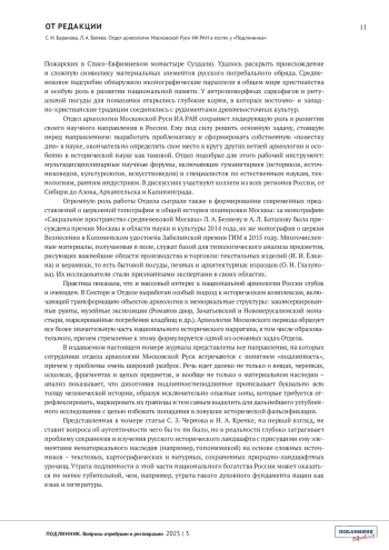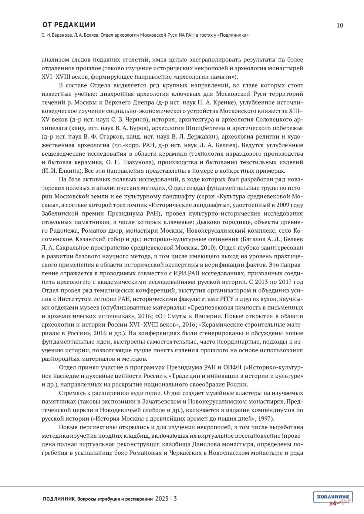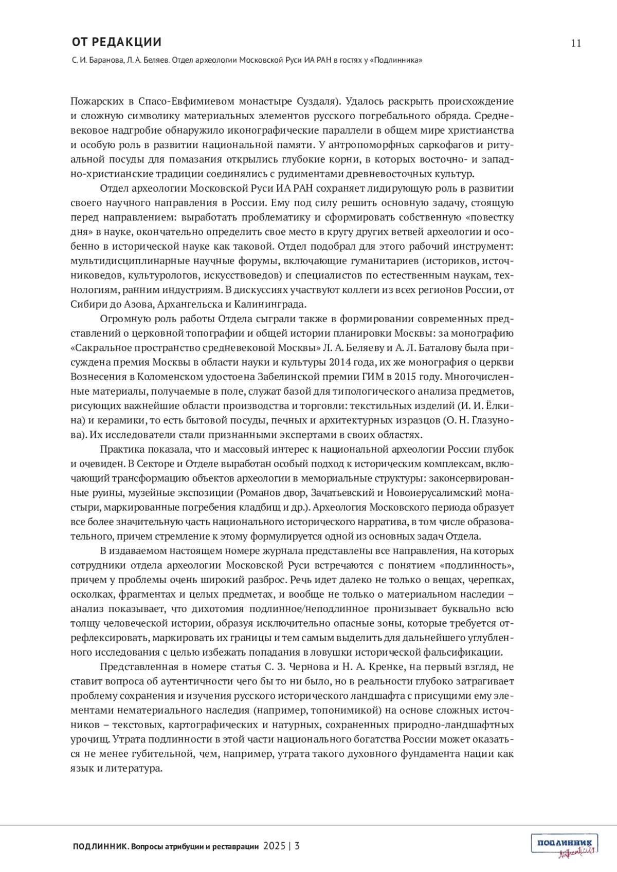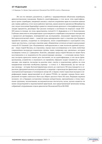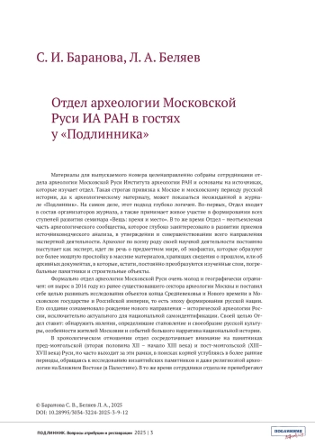 Материалы для выпускаемого номера целенаправленно собраны сотрудниками отдела археологии Московской Руси Института археологии РАН и основаны на источниках, которые изучает отдел. Такая строгая привязка к Москве и московскому периоду русской истории, да к археологическому материалу, может показаться неожиданной в журнале «Подлинник». На самом деле, этот подход глубоко логичен. Во-первых, Отдел входит в состав организаторов журнала, а также принимает живое участие в формировании всех ступеней развития семинара «Вещь: время и место». В то же время Отдел – неотъемлемая часть археологического сообщества, которое глубоко заинтересовано в развитии приемов источниковедческого анализа, в утверждении и совершенствовании всего направления экспертной деятельности. Археолог по всему роду своей научной деятельности постоянно выступает как эксперт, идет ли речь о предметном мире, об экофактах, которые образуют все более мощную прослойку в массиве материалов, хранящих сведения о прошлом, или об архивных документах, в которые, кстати, постоянно преобразуются изученные слои, погребальные памятники и строительные объекты.