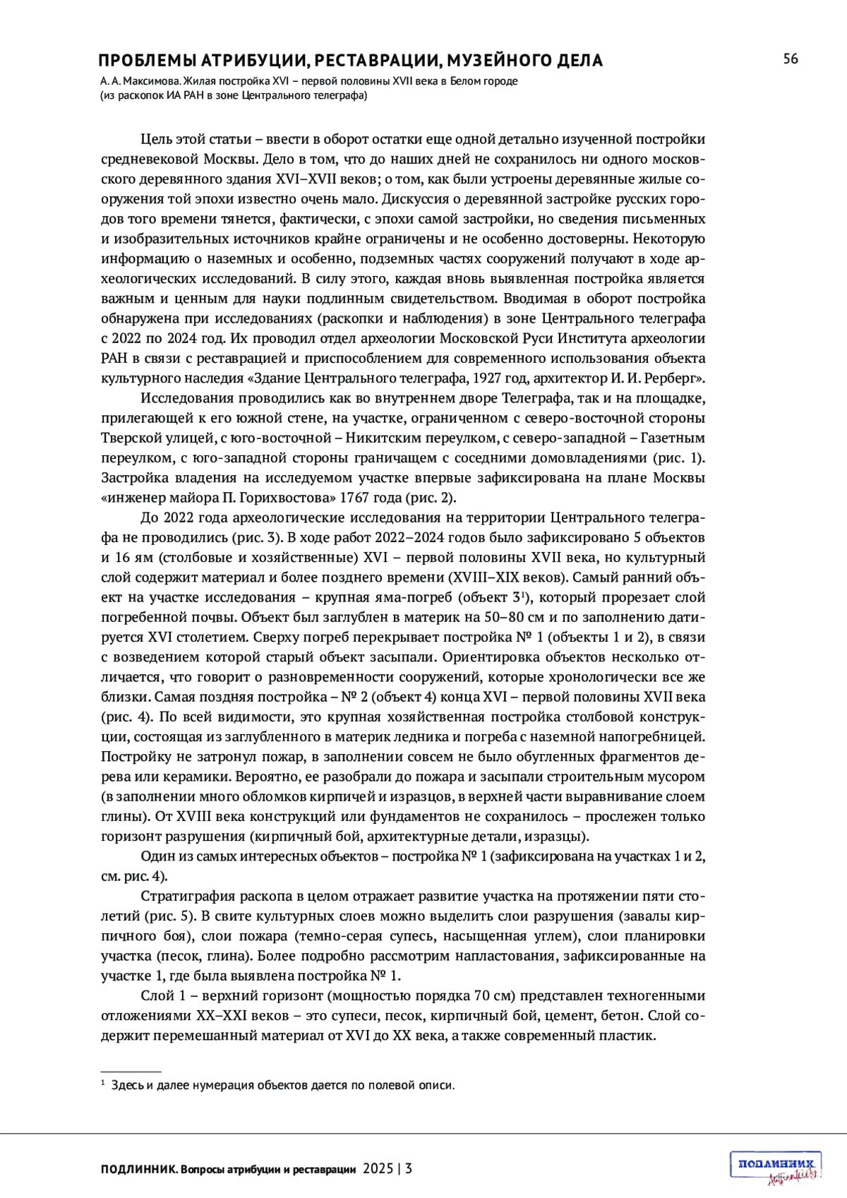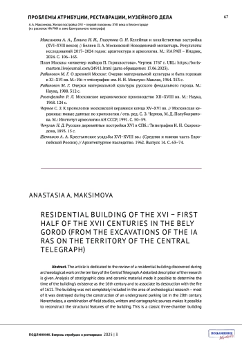 Цель этой статьи – ввести в оборот остатки еще одной детально изученной постройки средневековой Москвы. Дело в том, что до наших дней не сохранилось ни одного московского деревянного здания XVI–XVII веков; о том, как были устроены деревянные жилые сооружения той эпохи известно очень мало. Дискуссия о деревянной застройке русских городов того времени тянется, фактически, с эпохи самой застройки, но сведения письменных и изобразительных источников крайне ограничены и не особенно достоверны. Некоторую информацию о наземных и особенно, подземных частях сооружений получают в ходе археологических исследований. В силу этого, каждая вновь выявленная постройка является важным и ценным для науки подлинным свидетельством. Вводимая в оборот постройка обнаружена при исследованиях (раскопки и наблюдения) в зоне Центрального телеграфа с 2022 по 2024 год. Их проводил отдел археологии Московской Руси Института археологии РАН в связи с реставрацией и приспособлением для современного использования объекта культурного наследия «Здание Центрального телеграфа, 1927 год, архитектор И. И. Рерберг».
