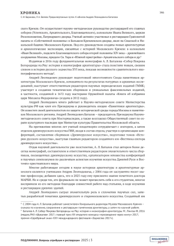 Первого июля 2025 года исполнилось 70 лет выдающемуся исследователю русской архитектуры Андрею Леонидовичу Баталову. Его творческая биография основательно сплетена с общим развитием науки об истории архитектуры России, а имя неразрывно связано с такими понятиями, как средневековое русское зодчество, церковная топография Москвы, история реставрации в России. Неотделимо оно и от изучения ключевых памятников русского искусства – Московского Кремля, собора Покрова на Рву и многих других.