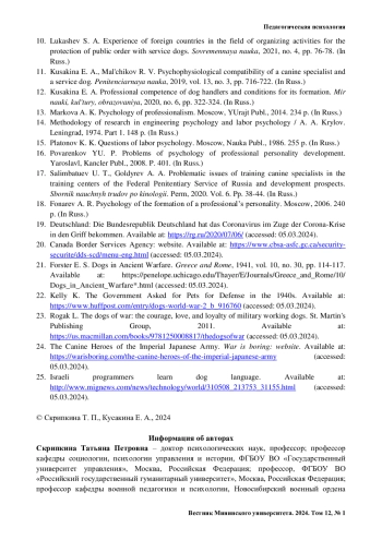 11. Кусакина Е. А., Мальчиков Р. В. Психофизиологическая совместимость специалиста-кинолога и служебной собаки // Пенитенциарная наука. 2019. Т. 13, № 3. С. 716-722.