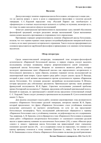 Результаты исследования. Проведенное исследование показывает, что по отношению к феномену «Парижской школы» в западной и отечественной мысли сложился ряд направлений. Тон дискуссии здесь задает подход П. Вальера, который отрицает релевантность этого понятия, указывая на отсутствие в «парижской школе» идейного единства. В то же время в отечественной мысли и у ряда западных ученых сложилось восприятие «парижской школы богословия» как целостного феномена. Дискуссия вокруг понятия «парижская школа», которая идет в наши дни, это во многом вопрос о месте и роли в современности философии и теологии русской эмиграции. Зачастую диаметральная противоположность анализируемых здесь мнений обусловлена философской традицией, которую разделяют авторы высказываний.