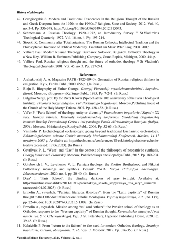 42. Gerogiorgakis S. Modern and Traditional Tendencies in the Religious Thought of the Russian and Greek Diaspora from the 1920s to the 1960s // Religion, State and Society. 2012. Vol. 40, no. 3-4. Pp. 336-348. https://doi.org/10.1080/09637494.2012.715043.