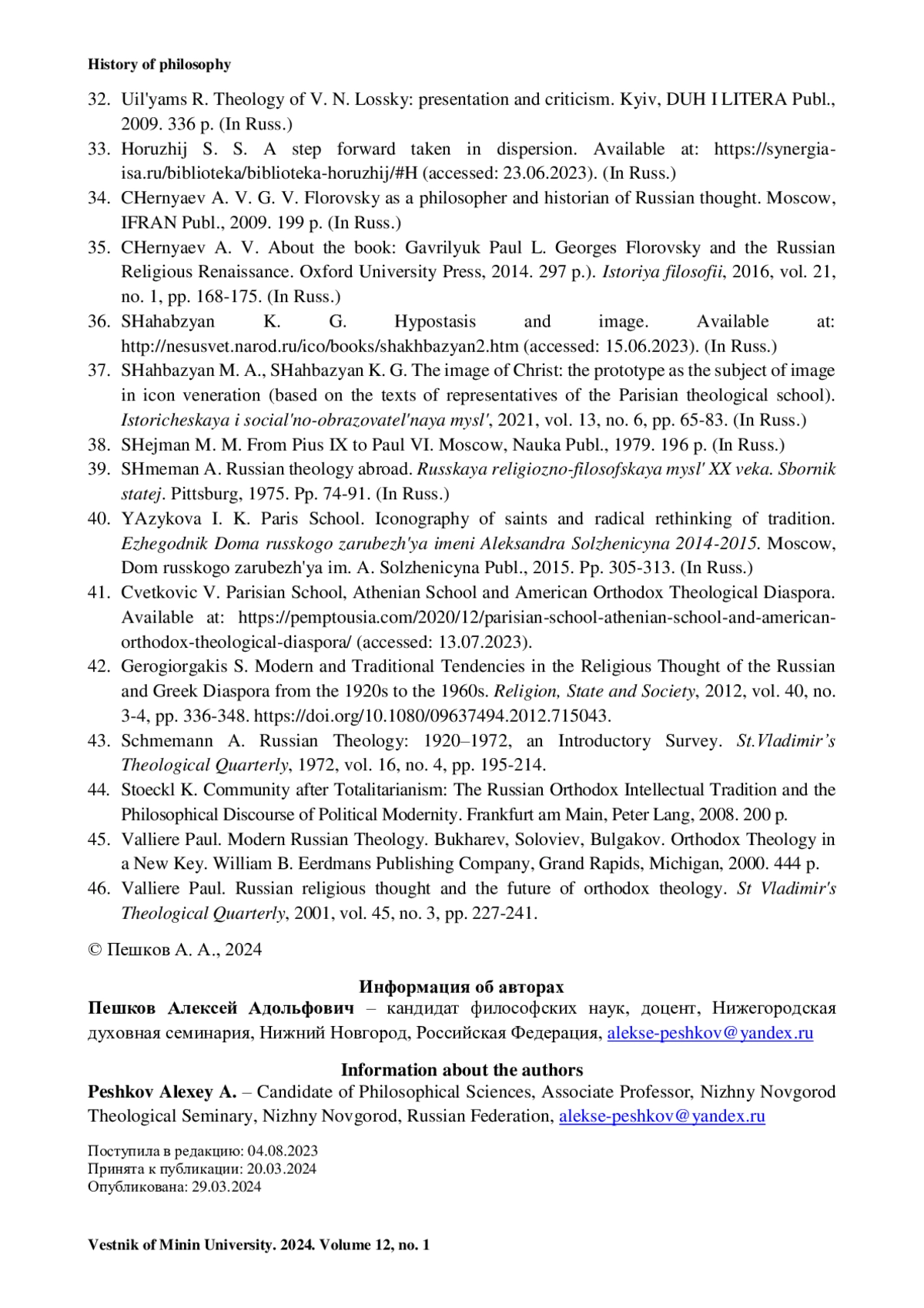 43. Schmemann A. Russian Theology: 1920-1972, an Introductory Survey // St.Vladimir’s Theological Quarterly. 1972. Vol. 16, no. 4. Pp. 195-214.