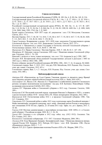 Отечественная война 1812 г. является одним из важнейших событий для всей истории Российской империи и одним из самых исследованных периодов в ней. Преимущественно историографический фокус смещен на военно-политическую историю Отечественной войны, в том числе среди исследователей, занимающихся исключительно Смоленской губернией. В основном научная литература посвящена положению данной губернии в период войны 1812 г. Период же ее восстановления является практически не проанализированным, хотя и привлекает внимание исследователей в рамках общей истории Смоленщины уже с позднеимперского периода [Вороновский, 1912; Грачев, 1912; Андреев, 1940]. Здесь надо отметить работы современных смоленских историков [Кононов, 2004; Никитина, 2009, 2010, 2020], чьи исследования, однако, базируются преимущественно на историографии ХХ в., документах Смоленского архива (ГАСО), а история губернии рассматривается в отрыве от общеимперского контекста.
