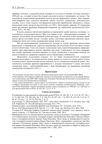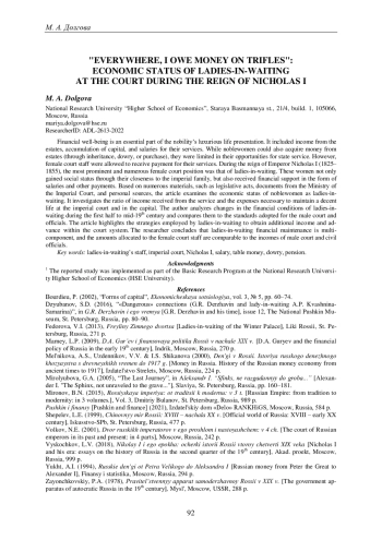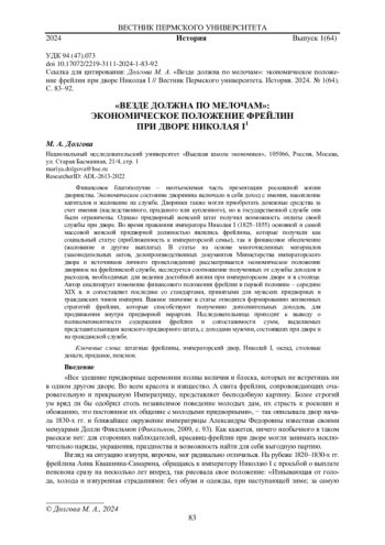 Финансовое благополучие - неотъемлемая часть презентации роскошной жизни дворянства. Экономическое состояние дворянина включало в себя доход с имения, накопление капиталов и жалование на службе. Дворянки также могли приобретать денежные средства за счет имения (наследственного, приданого или купленного), но в государственной службе они были ограничены. Однако придворный женский штат получил возможность оплаты своей службы при дворе. Во время правления императора Николая I (1825-1855) основной и самой массовой женской придворной должностью являлись фрейлины, которые получали как социальный статус (приближенность к императорской семье), так и финансовое обеспечение (жалование и другие выплаты). В статье на основе многочисленных материалов (законодательных актов, делопроизводственных документов Министерства императорского двора и источников личного происхождения) рассматривается экономическое положение дворянок на фрейлинской службе, исследуется соотношение полученных от службы доходов и расходов, необходимых для ведения достойной жизни при императорском дворе и в столице. Автор анализирует изменение финансового положения фрейлин в первой половине - середине XIX в. и сопоставляет последнее со стандартами, принятыми для мужских придворных и гражданских чинов империи. Важное значение в статье отводится формированию жизненных стратегий фрейлин, которые способствуют получению дополнительных доходов, для продвижения внутри придворной иерархии. Исследовательница приходит к выводу о поликомпонентности содержания фрейлин и сопоставимости сумм, выделяемых представительницам женского придворного штата, с доходами мужчин, состоявших при дворе и на гражданской службе.