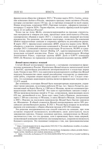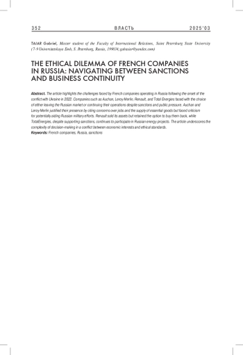 Статья освещает трудности, с которыми столкнулись французские компании, работающие в России, после начала конфликта с Украиной в 2022 г. Такие компании, как Auchan, Leroy Merlin, Renault и TotalEnergies, оказались перед выбором: уйти с российского рынка или продолжить деятельность, несмотря на санкции и общественное давление. Auchan и Leroy Merlin оправдывали свое присутствие заботой о рабочих местах и поставках жизненно важных товаров, однако столкнулись с критикой за возможное содействие российским военным усилиям. Renault, продав свои активы, оставила себе право на выкуп, а TotalEnergies, несмотря на поддержку санкций, продолжает работать в российских энергетических проектах. Статья подчеркивает сложность принятия решений в условиях конфликта между экономическими интересами и этическими стандартами.