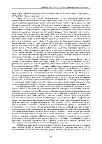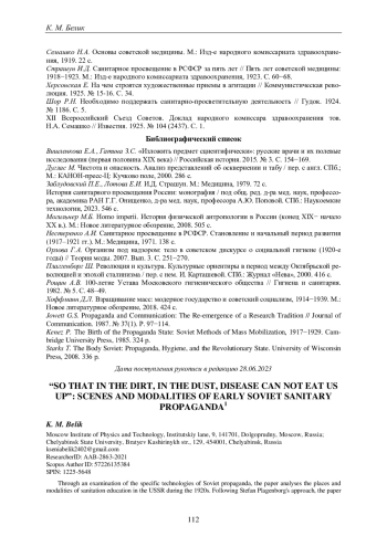 С помощью изучения специфики технологий советской пропаганды анализируются места и способы санитарного просвещения в СССР в 1920-е гг. С опорой на подход Штефана Плаггенборга аналитический акцент в работе ставится на модальности санитарной пропаганды. Из этой перспективы технология пропаганды, осуществляемая в рамках проводимой кампании санитарного просвещения советских граждан, рассматривается как проявление современных на 1920-е гг. тенденций, отвечающих новым нормам государства эпохи модерна. Анализируются четыре основных места осуществления санитарной пропаганды: дома санитарного просвещения с их мультиформатной работой, агитпоезда и их передвижные выставки, театральные сцены с гигиеническими постановками и специальными санитарными судами, избы-читальни и санитарная работа в них. Рассматриваются причины успехов и неудач различных способов санитарного просвещения. В зависимости от места и избираемой формы метод санитарной пропаганды использовал различные языковые и образные приемы: это помогло сместить изучение практик поддержания здоровья от теоретического осмысления к их пониманию в процессах осуществления ежедневных человеческих практик2. Исследование демонстрирует, как постепенно в раннее советское время выстраивалась целостная система эффективных технологий обучения санитарии и гигиене, которая опиралась на различные практики медикализации населения, перформативные и творческие методы и предшествующий опыт социально-политического информирования. Благодаря используемым формам санитарной пропаганды и различным репертуарам санитарного просвещения советский трудящийся смог стать участником процессов медикализации общества и начать самостоятельно интересоваться охраной своего здоровья.