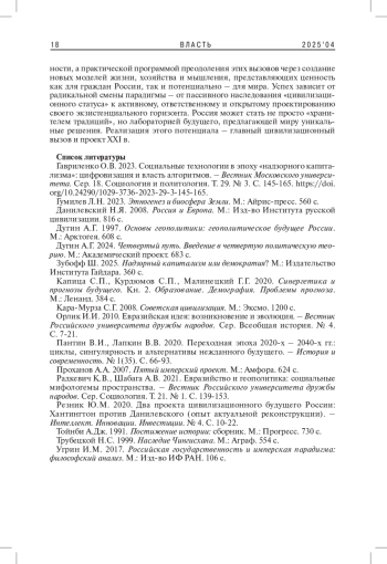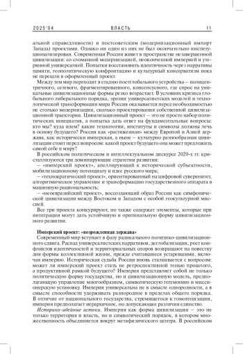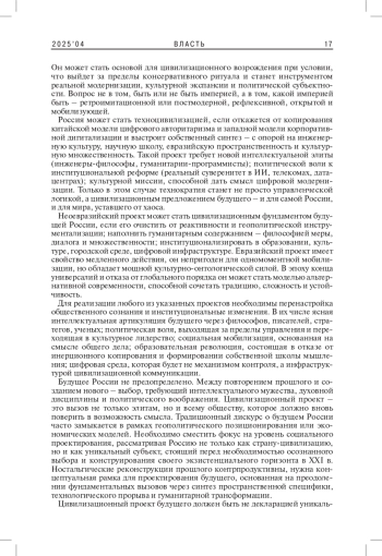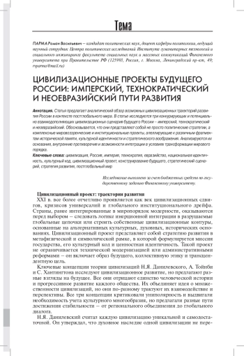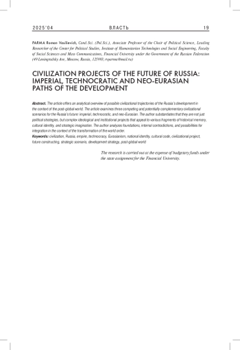 ПАРМА Р. В. ЦИВИЛИЗАЦИОННЫЕ ПРОЕКТЫ БУДУЩЕГО РОССИИ: ИМПЕРСКИЙ, ТЕХНОКРАТИЧЕСКИЙ И НЕОЕВРАЗИЙСКИЙ ПУТИ РАЗВИТИЯ // ВЛАСТЬ. 2025. ТОМ 33 № 4