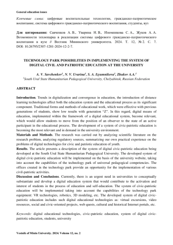 Результаты исследования. В статье представлено описание разрабатываемой системы цифрового гражданско-патриотического воспитания в ФГБОУ ВО «Южно-Уральский государственный гуманитарно-педагогический университет». Разработанная система цифрового гражданско-патриотического воспитания будет реализована на базе сайта вуза с учетом возможностей технопарка универсальных педагогических компетенций. Созданные в технопарке кабинеты дают возможность для реализации различных мероприятий гражданско-патриотической направленности.