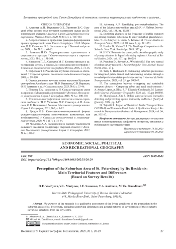 Целью исследования является качественная оценка условий проживания населения в пригородах Санкт-Петербурга, в том числе выявление отличий и общих закономерностей развития этих пригородов по разным направлениям от центра города. Материалы и методы. Использованы результаты онлайн-опроса жителей пригородов Санкт-Петербурга, по их отношению к комфортности проживания в своих населенных пунктах Результаты и обсуждение. В рамках установленных авторами условных границ пригородной зоны исследуемого региона выявлены типичные общие проблемы и схожие черты в развитии социальной жизни и связи с центром, а также различия северных, восточных и южных пригородов относительно условий проживания, транспортной доступности и самоидентификации. Заключение. По результатам качественной оценки жителями пригородов, участвующих в анкетировании, интересно было проследить степень влияния Санкт-Петербурга на образ жизни и особенности взаимодействия в системе «центр-пригород» в различных группах пригородных территорий. Существует необходимость проведения скоординированной пригородной «региональной политики»; большая часть населения пригородной зоны не планирует покидать её пределы; соответственно её развитие, в особенности пространственное, будет продолжаться и дальше.