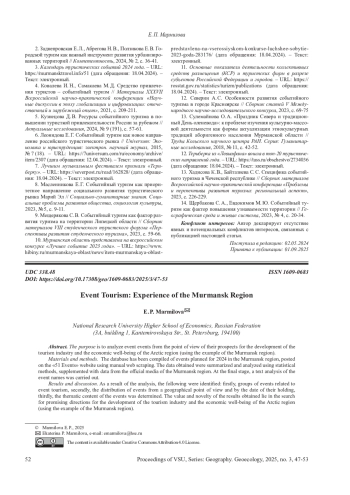 Целью является проведение анализа событийных мероприятий с точки зрения их перспектив развития туристической отрасли и экономического благосостояния арктического региона (на примере Мурманской области). Материалы и методы. Составлена база данных из планируемых к проведению в 2024 г событий в Мурманской области, размещенных на сайте «51 событие» с помощью ручного веб-скрейпинга. Полученные данные были обобщены и проанализированы с помощью статистических методов, дополнены данными из официальных средств массовой информации Мурманской области. На завершающем этапе был проведен текстовый анализ названий мероприятий. Результаты и обсуждение. В результате анализа были выделены: во-первых, группы мероприятий, относящихся к событийному туризму, во-вторых, распределение событий с географической точки зрения и по дате их проведения, в-третьих, определено тематическое содержание мероприятий. Ценность и новизна полученных результатов заключаются в поиске перспективных направлений развития туристической отрасли и экономического благосостояния арктического региона (на примере Мурманской области). Заключение. К ключевым особенностям практики организации событий в регионе является то, что органы местного самоуправления активно реализуют туристский потенциал Мурманской области, события в регионе выступают катализатором развития внутреннего туризма, способствуя экономическому развитию малых населенных пунктов, а также служат для привлечения новых кадров в регион. Выводы могут быть масштабированы на другие регионы РФ при учёте местных особенностей.