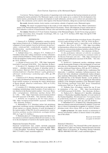 1. Гуторова К. А. Проблемы и перспективы развития событийного туризма II Материалы Международной научно-практической конференции “Социально-культурная деятельность: векторы исследовательских и практических перспектив”, 2023, с. 304-309. EDN: JPVIRY