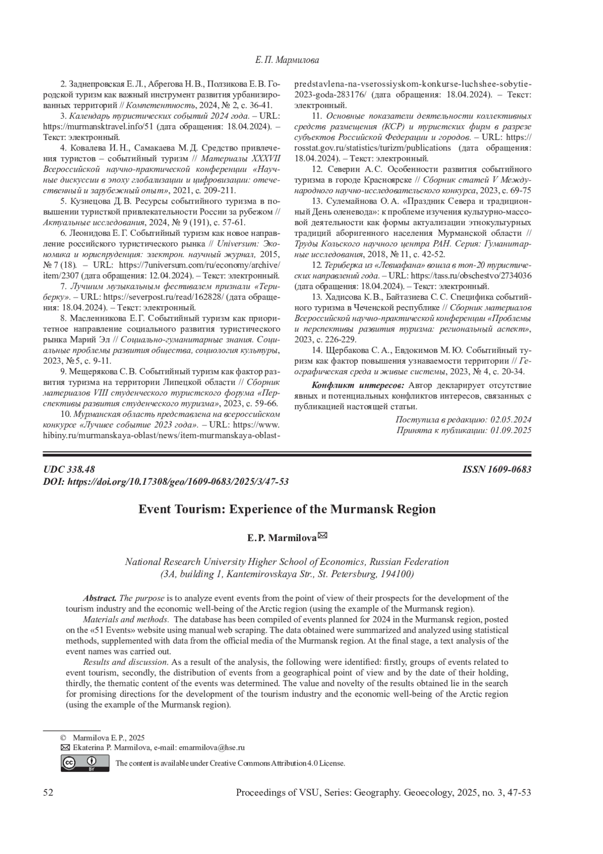 2. Заднепровская Е. Л., Абрегова Н. В., Ползикова Е. В. Го -родской туризм как важный инструмент развития урбанизированных территорий II Компетентность, 2024, № 2, с. 36-41. EDN: EGVKJY