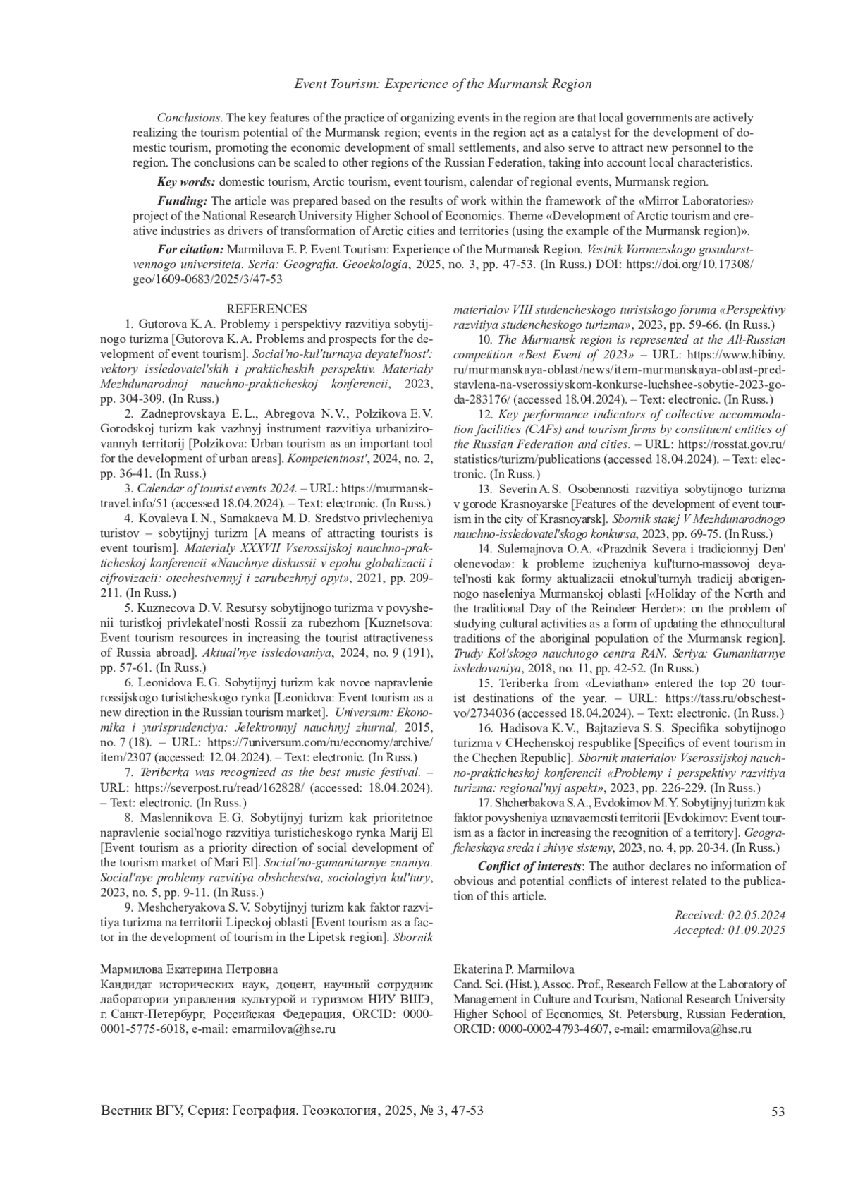 8. Масленникова Е.Г. Событийный туризм как приоритетное направление социального развития туристического рынка Марий Эл II Социально-гуманитарные знания. Социальные проблемы развития общества, социология культуры, 2023, №5, с. 9-11.
