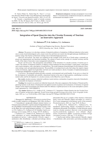 7. Рубановат Н. И., Гудкова Н. К., Горбунова Т. Л. Креативная индустрия в действии: циркулярная экономика и преобразование нарушенных территорий в уникальные туристические объекты II Материалы I Международной научной конференции “Творчество и бизнес”, 2024, с. 18-22.