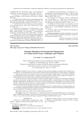 10. Кулаковская В.А., Санин А.Ю. К вопросу об экономических последствиях конфликтов природопользования Стратегическое планирование в управлении природопользованием на приморских туристических территориях.. в прибрежной зоне Балтийского моря II Государственное управление. Электронный вестник, 2022, №90, с. 126-142. EDN: NASZLP