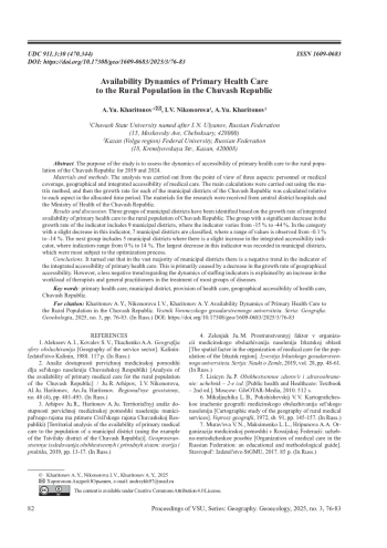 2. Анализ доступности первичной медицинской помощи для сельского населения Чувашской Республики / Ю.Р. Архипов, И. В. Никонорова, Ал.Ю. Харитонов, Ан.Ю. Харитонов II Региональные геосистемы, № 48 (4), с. 481-493.
