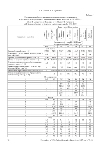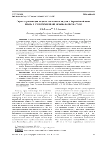 Целью статьи является комплексный анализ состава и объемов загрязняющих веществ (ЗВ), поступающих в водные объекты со сточными водами в федеральных округах и ряде крупных речных бассейнов (Невы, Северной Двины, Волги, Оки, Камы, Дона, Кубани) Европейской части России (ЕЧС) в 2015-2020 гг., и сопоставление сброса ЗВ с фактическим содержанием их в речных водах. Материалы и методы. Исходными материалами послужили данные о годовом сбросе ЗВ по субъектам и федеральным округам в составе ЕЧС и сведения об их средней годовой концентрации в речных водах, содержащиеся в статистических справочниках. Рассматривается содержание БПК полного (показателя органических веществ), нефтепродуктов, сухого остатка (минерализации), железа, нитрат-аниона, меди. Применен метод географо-гидрологического сопоставления. Результаты и обсуждение. Показано, что федеральные округа существенно различаются между собой как по величине общего сброса отдельных ЗВ, сбрасываемых со сточными водами, так и приходящегося на одного жителя, км2 площади и км3 местного речного стока. Не выявлено какой-то общей явно выраженной тенденции в величине сброса ЗВ в 2015-2020 гг. Вместе с тем выявляется превышение ПДК в большинстве замыкающих створов рассматриваемых речных бассейнов и значительное превышение фактического годового выноса ЗВ, в том числе сверхнормативного, по сравнению с годовым сбросом со сточными водами. Выводы. Значительное превышение фактического годового выноса ЗВ в замыкающих створах речных бассейнов над сбросом их со сточными водами свидетельствует о преобладающем вкладе в загрязнение рассматриваемых водных объектов других источников, прежде всего диффузного стока с водосборов.