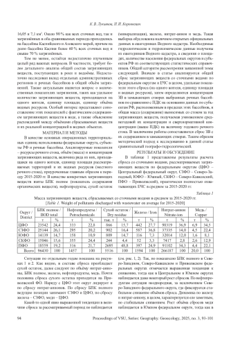 Общий алгоритм рассмотрения заявленной темы следующий. Вначале в статье анализируется общий сброс загрязняющих веществ со сточными водами по федеральным округам и ЕЧС в целом, удельные показатели этого сброса (на одного жителя, единицу площади и водных ресурсов), затем определяются концентрация ЗВ в замыкающих створах выбранных речных бассейнов по сравнению с ПДК на основании данных по субъектам РФ, расположенным в пределах этих бассейнов, и общая масса (содержание) выносимых со стоком за год загрязняющих веществ, получаемая умножением среднегодовой их концентрации и сверхнормативной концентрации (выше ПДК) на величину годового речного стока. В заключение работы сопоставляется сброс ЗВ с их содержанием в замыкающих створах. Таким образом методический подход к исследованию в данной статье сравнительный географо-гидрологический.