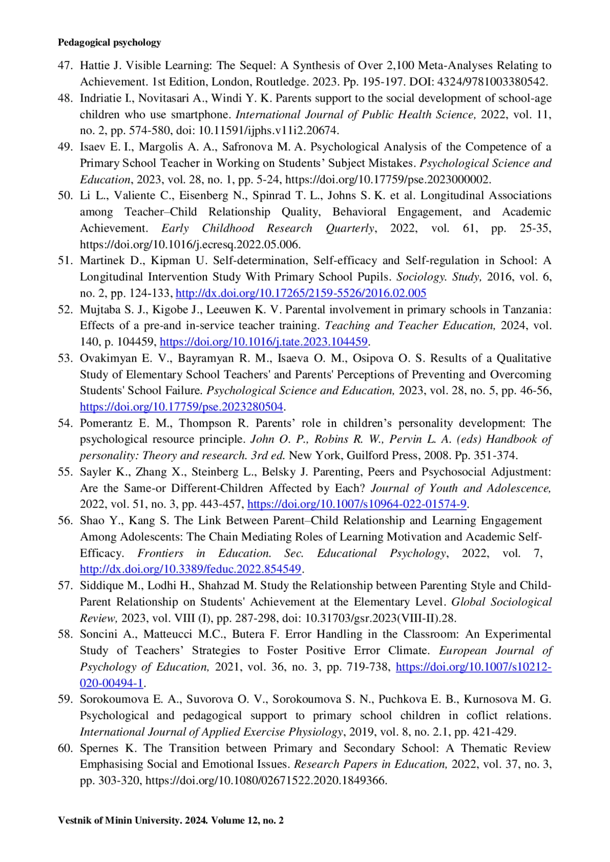 56. Shao Y., Kang S. The Link Between Parent-Child Relationship and Learning Engagement Among Adolescents: The Chain Mediating Roles of Learning Motivation and Academic Self-Efficacy // Frontiers in Education. Sec. Educational Psychology. 2022. Vol. 7. https://doi.org/10.3389/feduc.2022.854549.