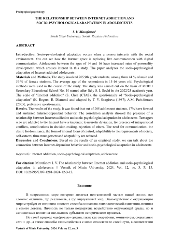 Введение. Социально-психологическая адаптация возникает при взаимодействии личности с социальной средой. Можно заметить, как интернет-пространство подменяет живое общение на цифровое. У подростков в возрасте от 14 до 16 лет увеличиваются темпы развития личности, что вызывает интерес к данному исследованию. В работе анализируется социально-психологическая адаптация у интернет-зависимых подростков.