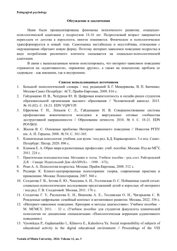 Обсуждение и заключения. Основываясь на результатах эмпирического исследования, можно говорить о наличии связи интернет-зависимого поведения и социально-психологической адаптации у подростков.