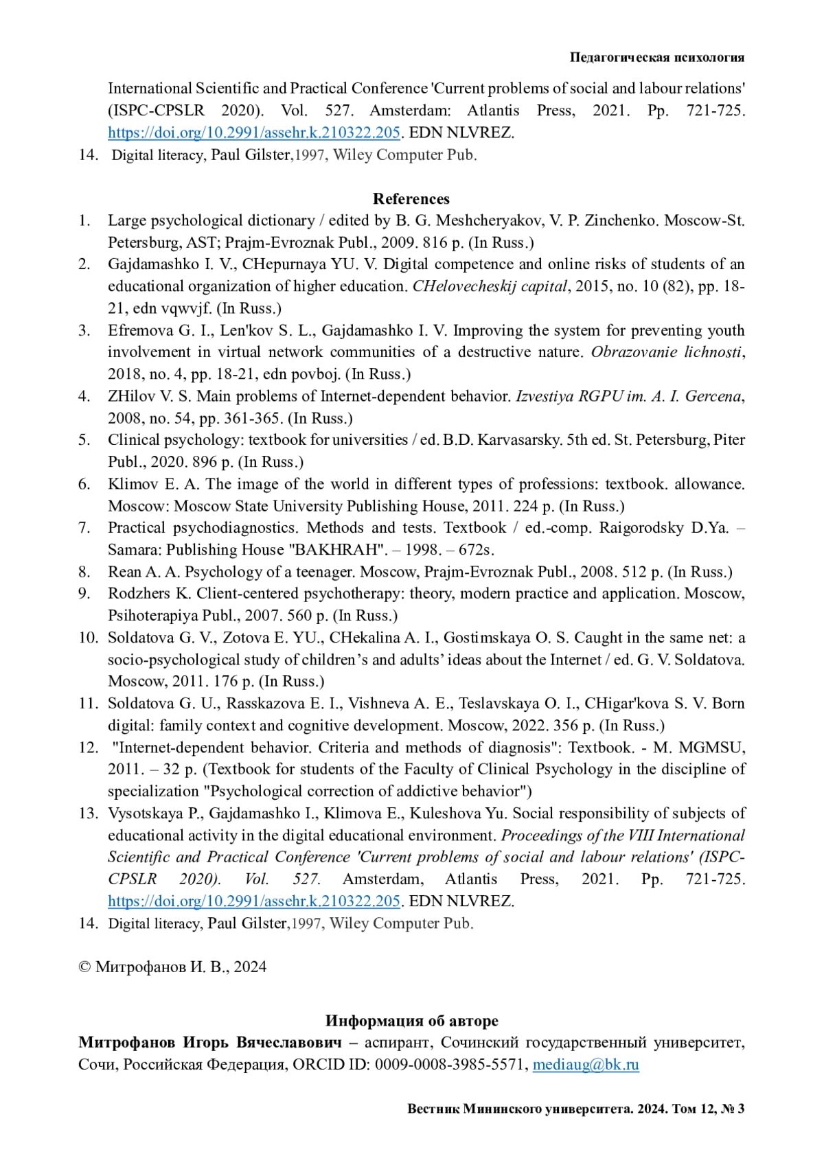 11. Солдатова Г. У., Рассказова Е. И., Вишнева А. Е., Теславская О. И., Чигарькова С. В. Рожденные цифровыми: семейный контекст и когнитивное развитие. Москва, 2022. 356 с.
