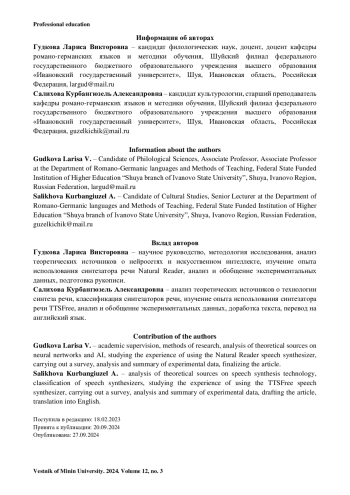 Результаты исследования. Список публикаций, изученных в процессе проведения научного исследования, составляет 40 российских и зарубежных работ. Данные материалы позволили изучить применение технологии text-to-speech с использованием нейросетей, а также синтезаторов речи Natural Reader и TTSFree на занятиях по иностранному языку в вузе, что позволило доказать на практике эффективность применения анализируемых сервисов для совершенствования техники чтения на английском и немецком языках.