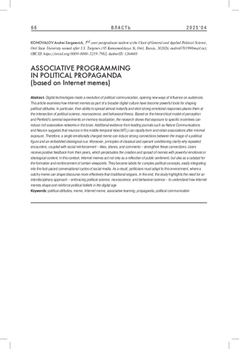 Статья посвящена анализу интернет-мемов как инструмента формирования политических установок. Автор опирается на нейрофизиологические и бихевиористские исследования, объясняющие механизмы восприятия и закрепления информации; рассматривает, каким образом интернет-мемы способны вызывать у аудитории устойчивые ассоциации с определенными политическими нарративами. Особое внимание в работе уделяется роли повторения и социального подкрепления (лайки, репосты). Таким образом, на основании всех данных автор демонстрирует, что интернет-мемы не просто отражают общественные настроения, но и активно конструируют политическую реальность, оказывая влияние на общественные дискурсы и формируя идеологические предпочтения целевой аудитории.