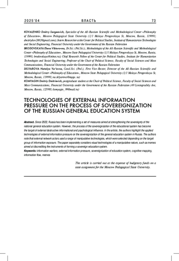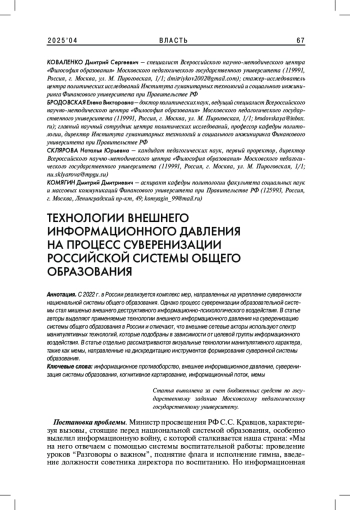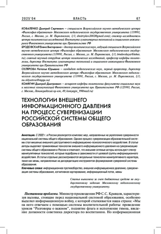 С 2022 г. в России реализуется комплекс мер, направленных на укрепление суверенности национальной системы общего образования. Однако процесс суверенизации образовательной системы стал мишенью внешнего деструктивного информационно-психологического воздействия. В статье авторы выделяют применяемые технологии внешнего информационного давления на суверенизацию системы общего образования в России и отмечают, что внешние сетевые акторы используют спектр манипулятивных технологий, которые подобраны в зависимости от целевой группы информационного воздействия. В статье отдельно рассматриваются визуальные технологии манипулятивного характера, такие как мемы, направленные на дискредитацию инструментов формирования суверенной системы образования.