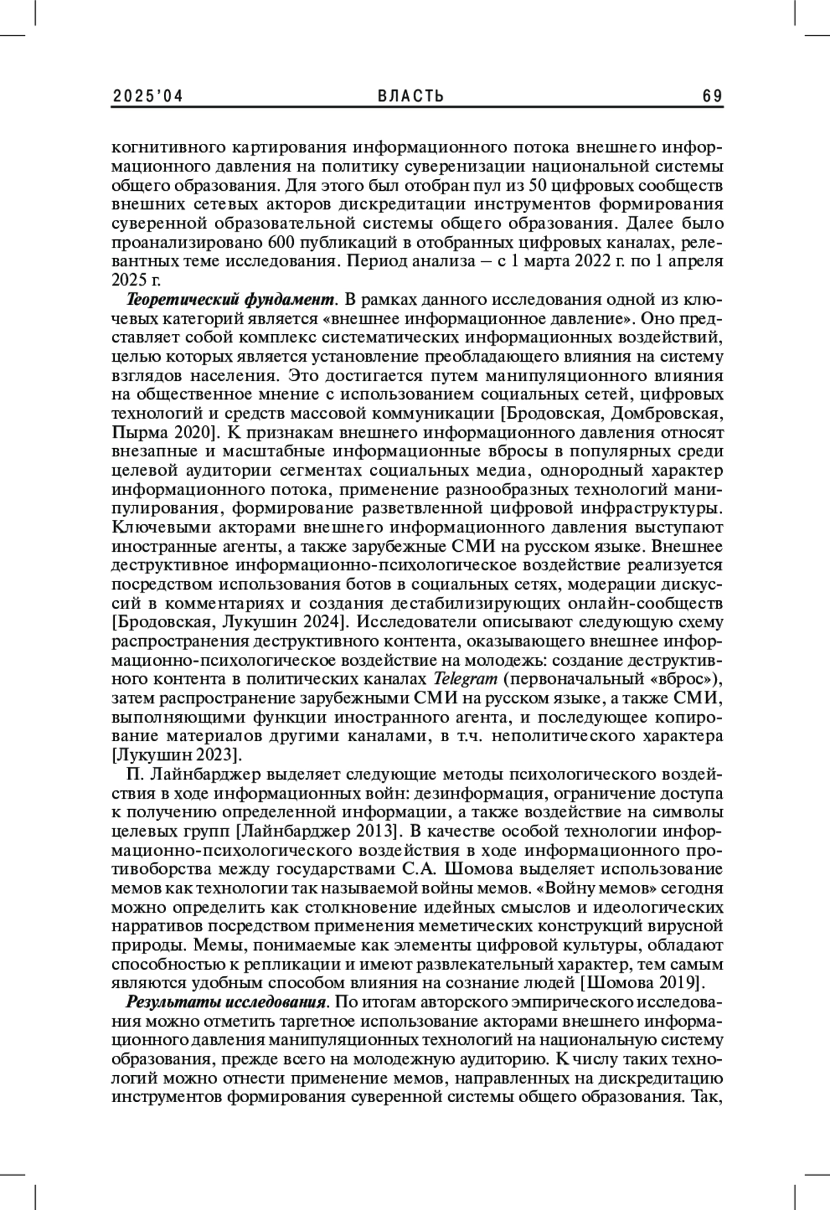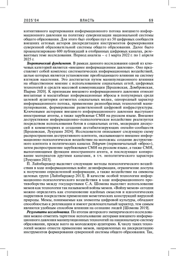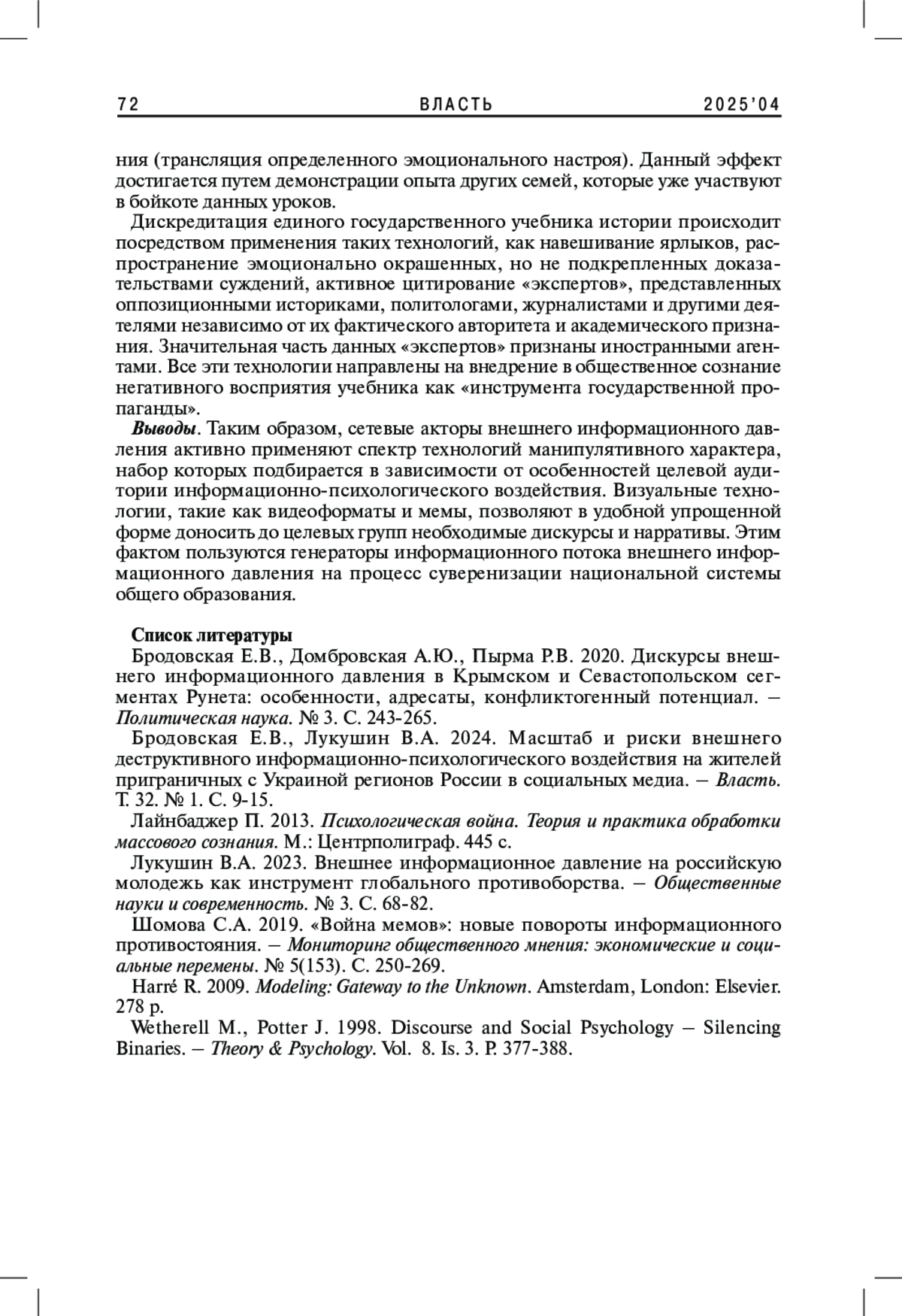 2. Бродовская Е.В., Лукушин В.А. 2024. Масштаб и риски внешнего деструктивного информационно-психологического воздействия на жителей приграничных с Украиной регионов России в социальных медиа. - Власть. Т. 32. № 1. С. 9-15. EDN: RBAQFS