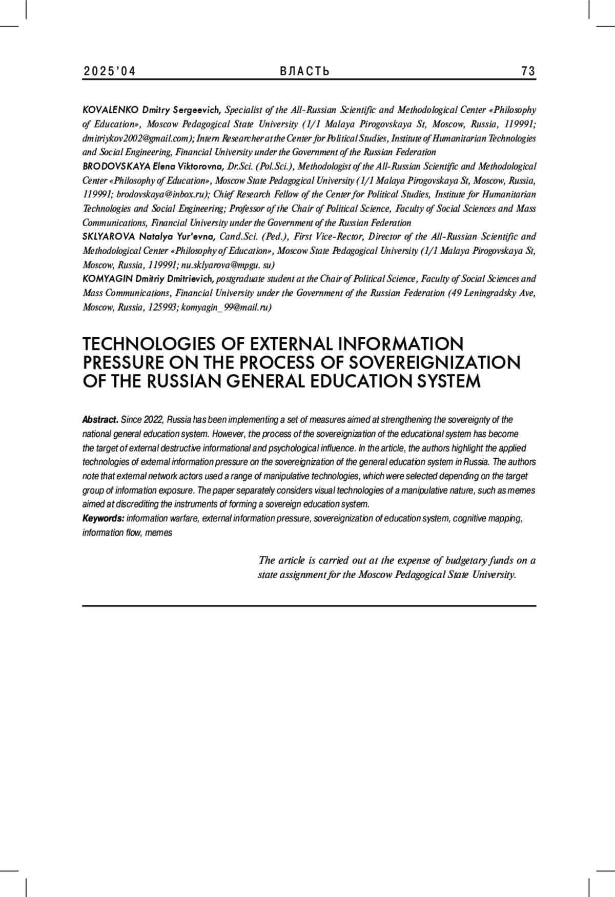1. Бродовская Е.В., Домбровская А.Ю., Пырма Р.В. 2020. Дискурсы внешнего информационного давления в Крымском и Севастопольском сегментах Рунета: особенности, адресаты, конфликтогенный потенциал. - Политическая наука. № 3. С. 243-265. EDN: YFVBTI